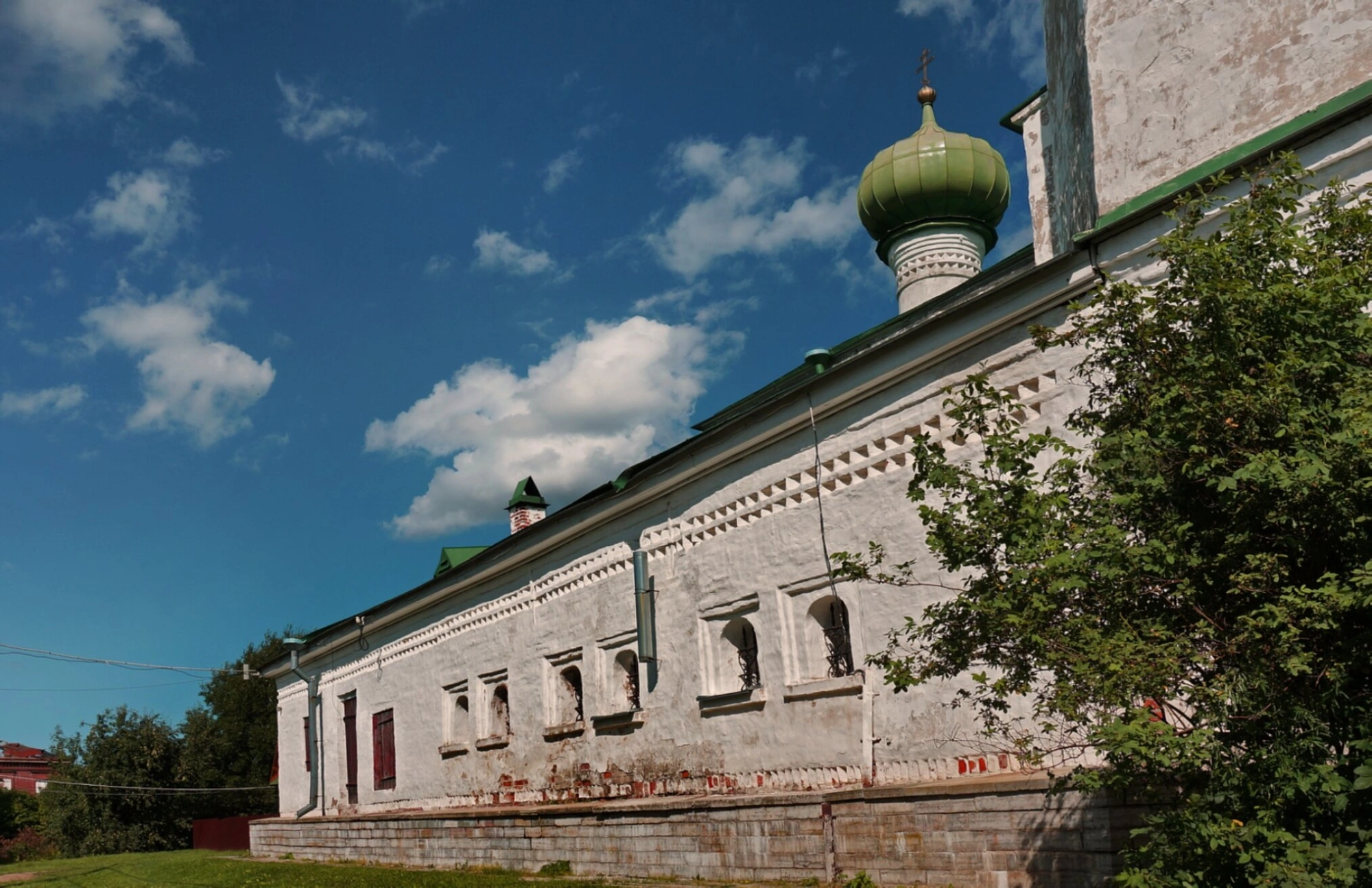 Венчает храм величественный зеленый купол-луковица, установленный на высоком барабане и увенчанный православным крестом. На кровле, покрытой зеленой краской, также можно различить вторую, меньшую по размеру главку, что характерно для традиционной русской церковной архитектуры. На поверхности стен видны благородные следы времени, придающие храму особую духовную атмосферу.