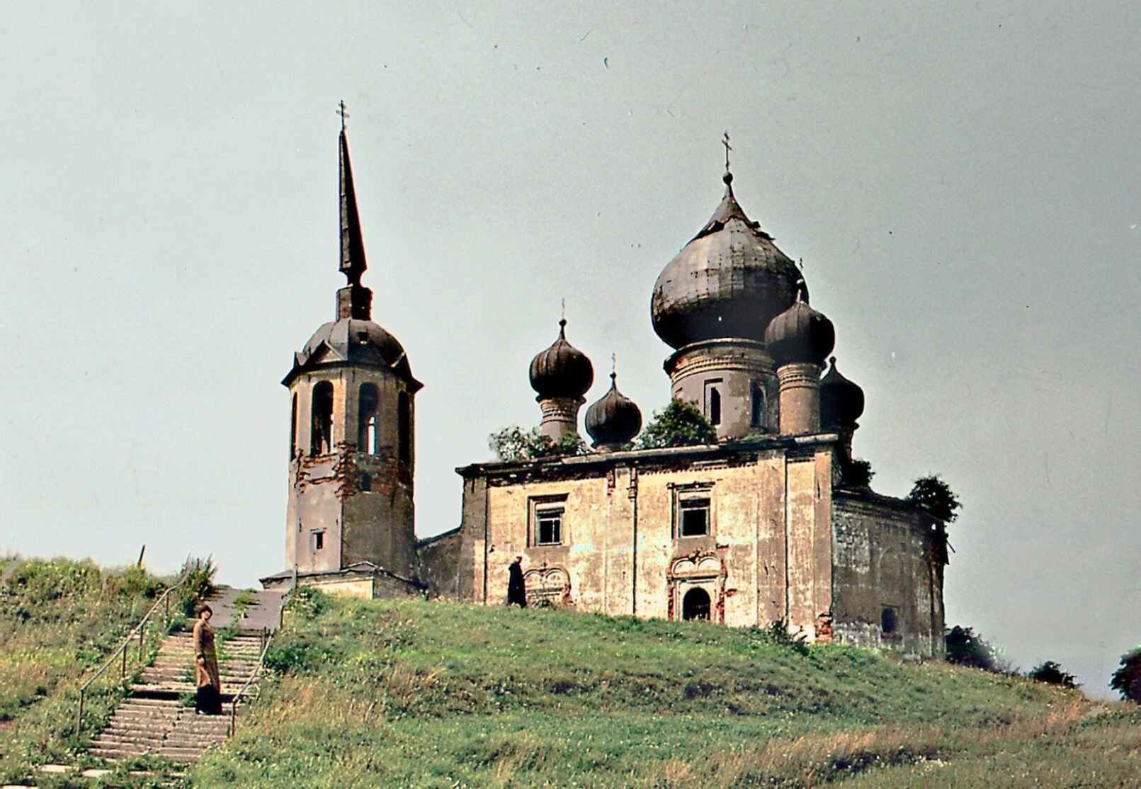 К сожалению, на момент съемки храм пребывает в полуразрушенном состоянии. На стенах видны следы многовековой ветхости, оконные и дверные проемы лишены заполнений, а верхняя часть колокольни частично обрушена. Такое состояние памятника архитектуры свидетельствует о сложной исторической судьбе православной святыни в советский период.
