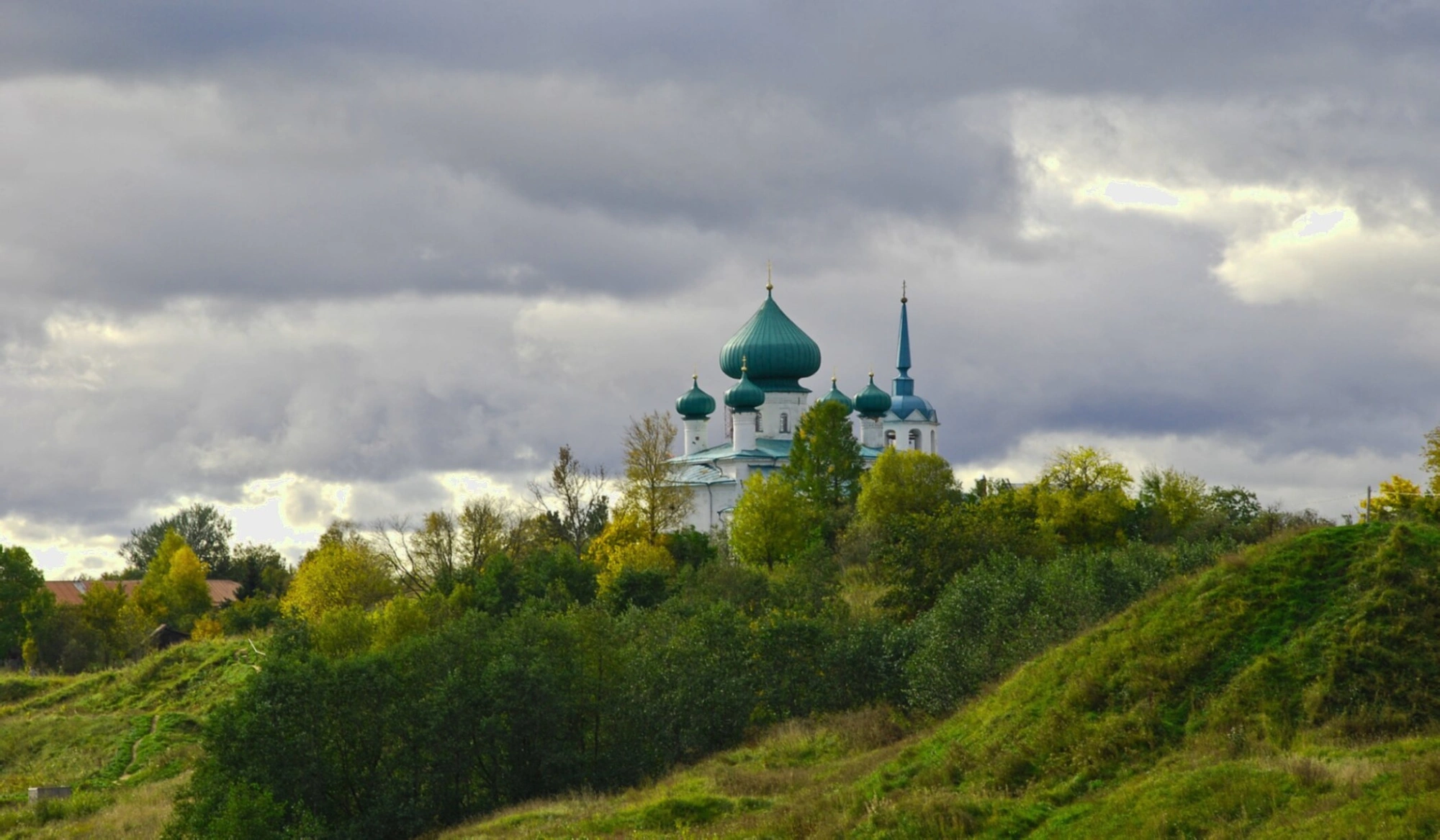 Храм располагается на вершине живописного холма, поросшего осенней травой и деревьями с пожелтевшей листвой, что придаёт пейзажу особое очарование и умиротворение. Пасмурное небо, покрытое облаками, мягко рассеивает свет, подчёркивая строгую красоту древней архитектуры и создавая атмосферу тишины и благоговения.