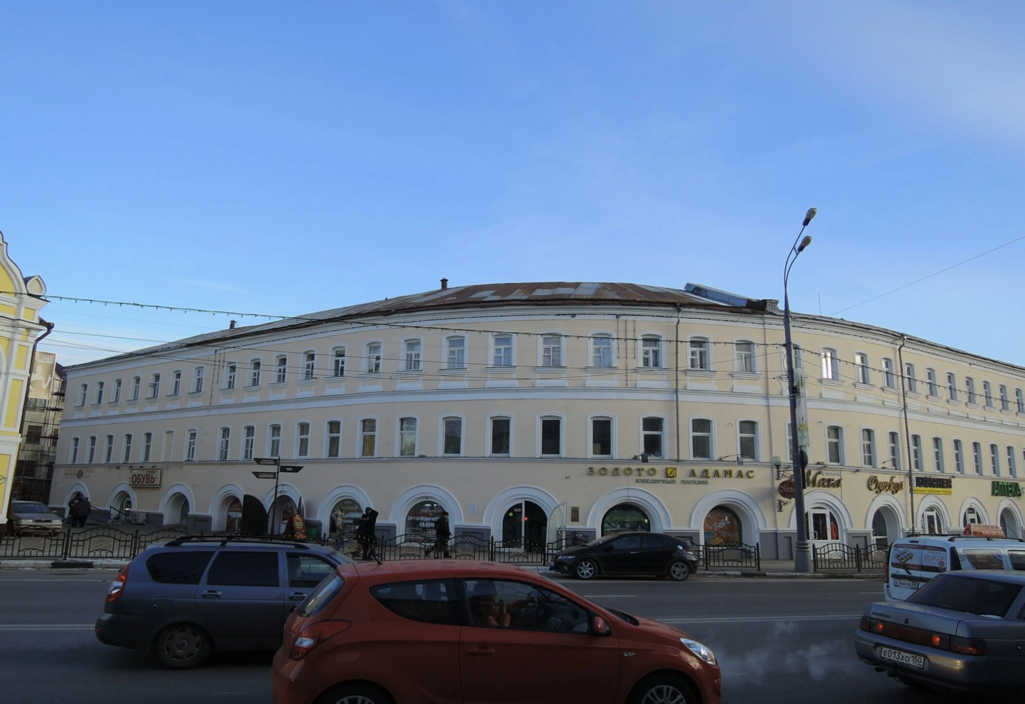 На переднем плане фотографии видна городская инфраструктура с проезжей частью и транспортными средствами, что подчёркивает гармоничное сочетание духовного центра с современной жизнью населённого пункта. Уличное освещение и соседние здания создают естественный городской антураж, не отвлекая внимания от архитектурной доминанты - православного храма.
