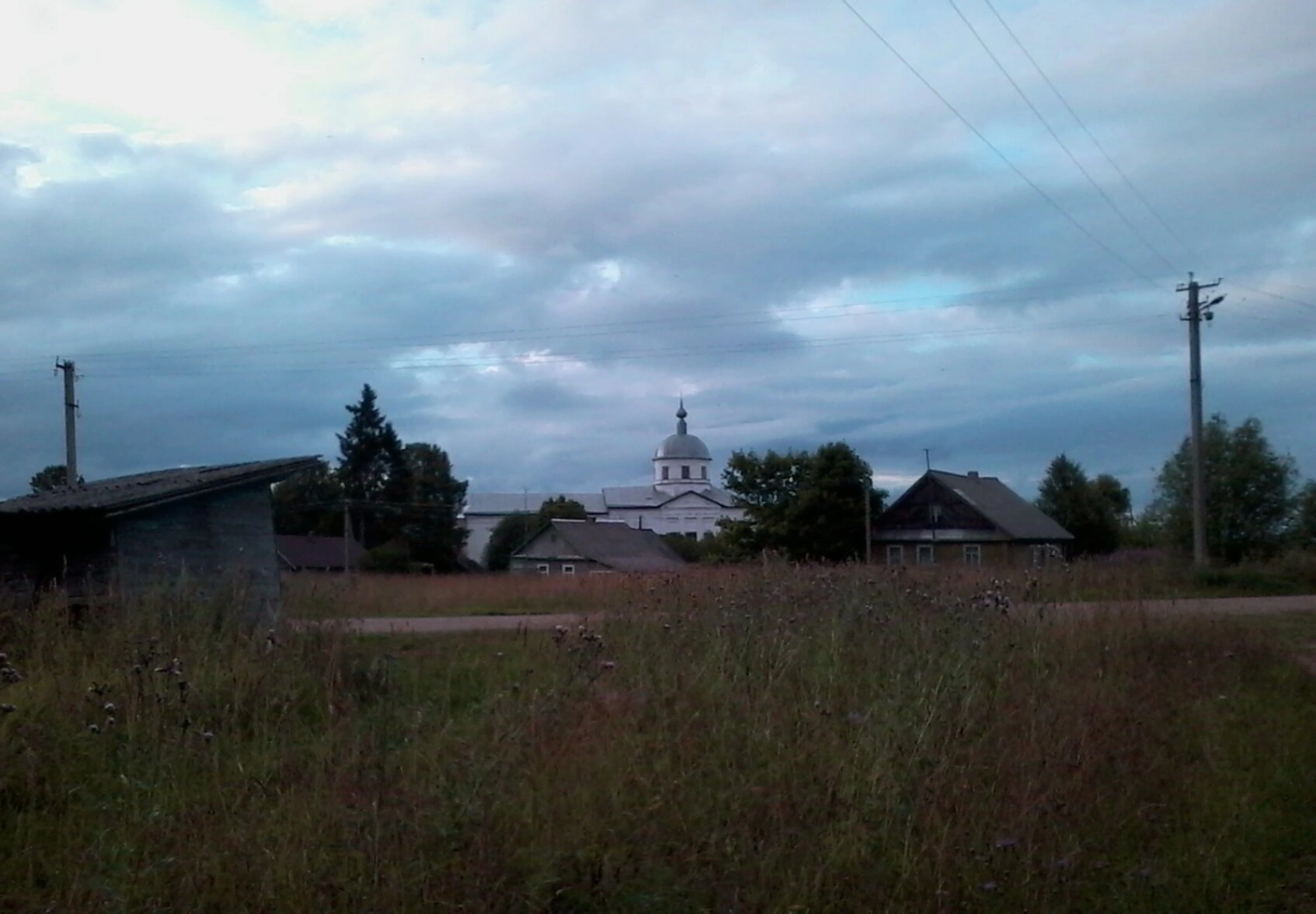 Передний план фотографии занимает поле с естественной растительностью, что подчёркивает единение храма с окружающей природой. По сторонам от церкви виднеются скромные деревенские постройки, составляющие единый ансамбль с культовым сооружением. Присутствие деревянного столба с электропроводами напоминает о современной инфраструктуре, обслуживающей местных жителей.