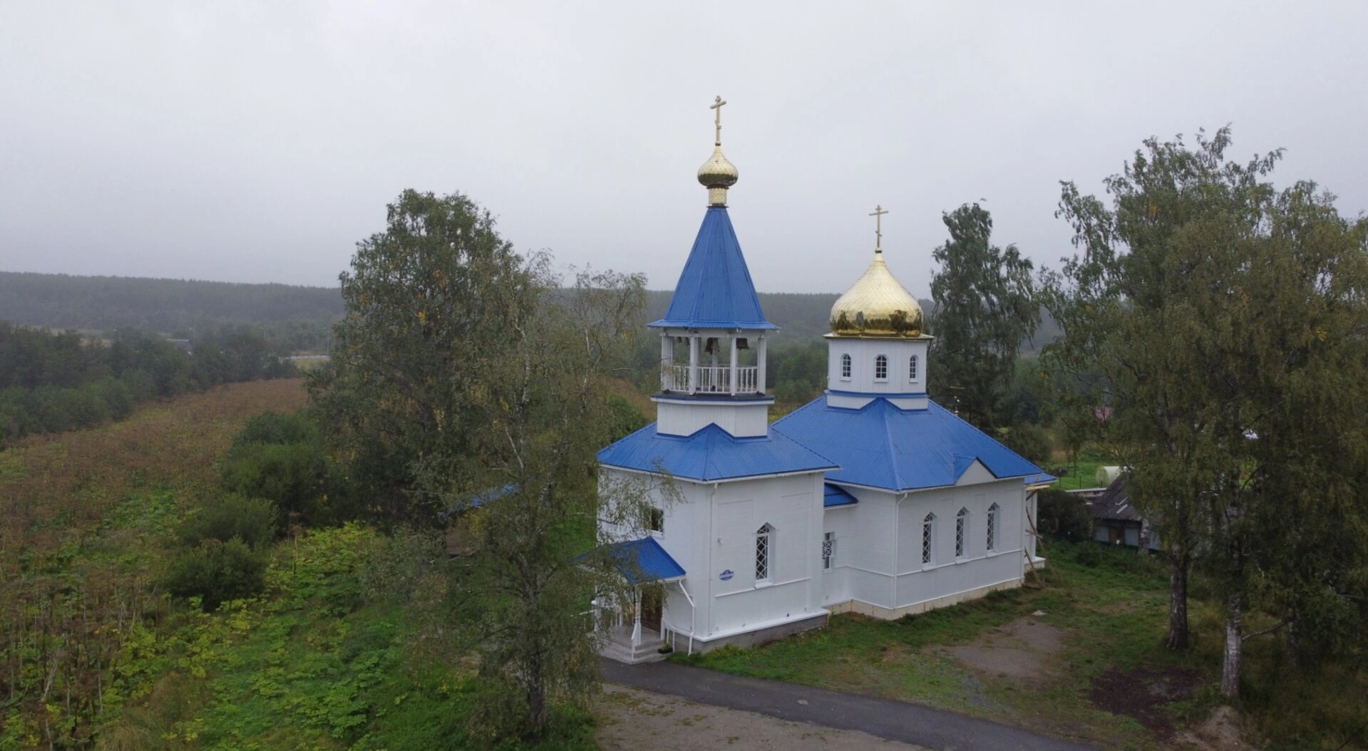На фотографии храм предстает в своем восстановленном благолепии. Главный золотой купол над молитвенным залом и синий шатер колокольни, увенчанные православными крестами, символизируют горний мир и молитвенный порыв к Небу. Арочные окна с белыми наличниками оживляют фасад. Церковь мирно стоит в окружении природы Карелии: асфальтированная дорожка ведет ко входу, а на заднем плане простирается бескрайний лесной массив, подчеркивая уединенность и духовную сосредоточенность этого места. Панорама, снятая под пасмурным небом, передает тихую, строгую и созерцательную красоту русского Севера. В настоящее время церковь в деревне Лумбуши является действующим приходом Петрозаводской и Карельской епархии Русской Православной Церкви и памятником историко-культурного наследия региона.