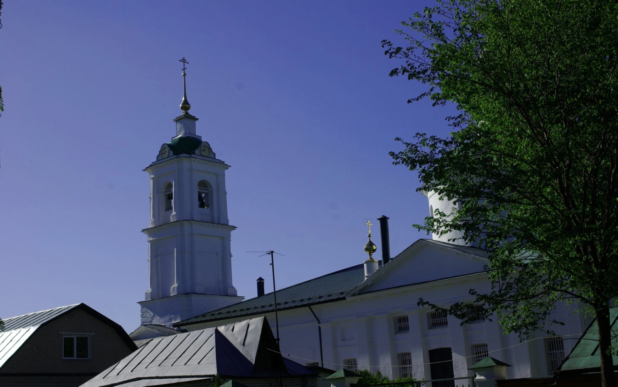 Храм гармонично вписан в окружающий природный ландшафт. Снимок сделан в ясный день: над святыней простирается безоблачное голубое небо, а по сторонам раскинулась зелёная листва деревьев. На переднем плане виднеются крыши других строений поселения, что подчёркивает уединённый, но не оторванный от мира характер этого духовного места. Общий вид излучает благодать, спокойствие и умиротворение, свойственные православным обителям.