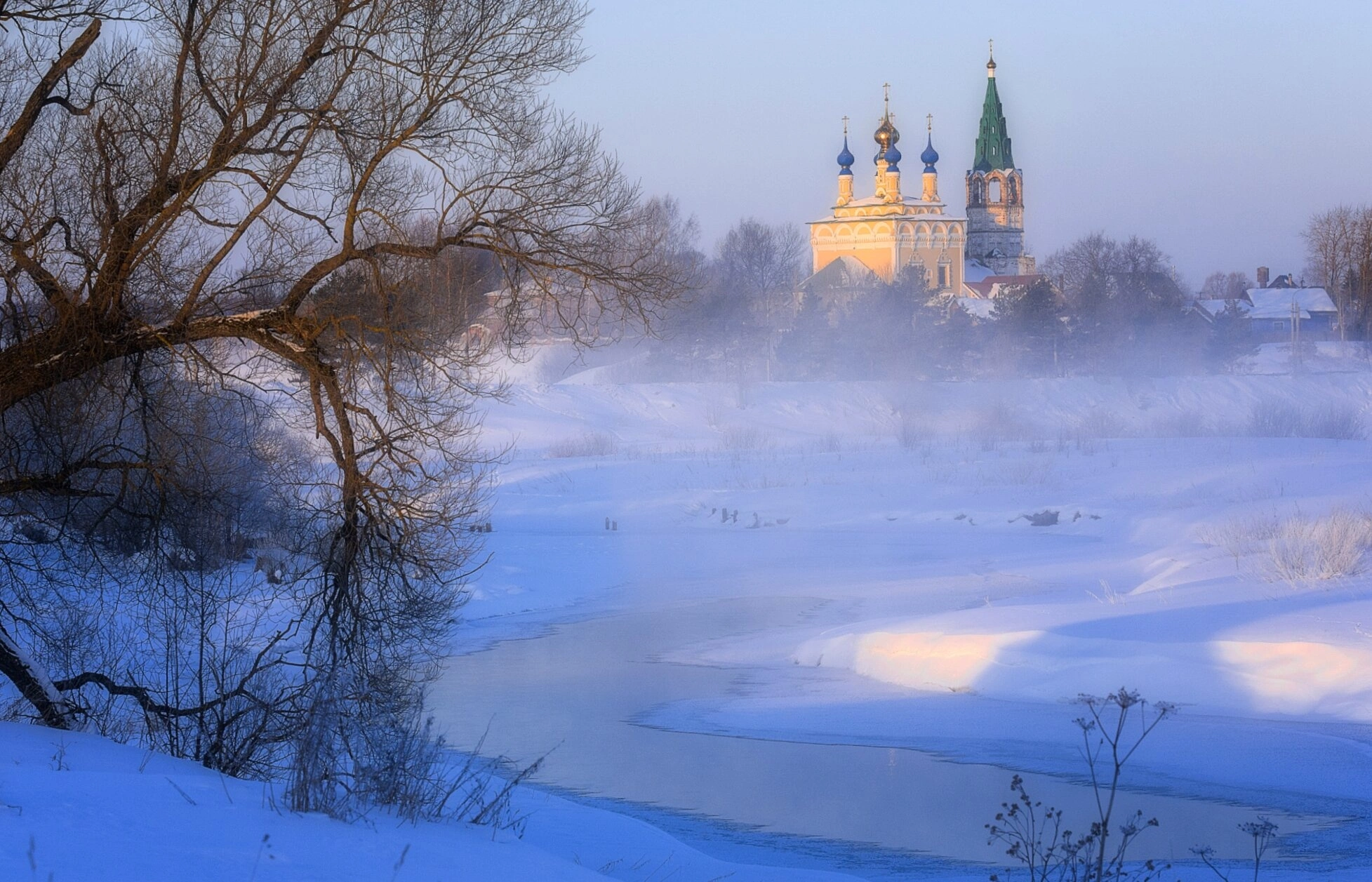 На переднем плане изображения видна замёрзшая прибрежная растительность и покрытое инеем дерево с голыми ветвями, что подчёркивает суровую красоту русского севера в холодное время года. Церковь Рождества Богородицы, исторически относящаяся к Горицкому Воскресенскому женскому монастырю, является выдающимся памятником церковной архитектуры и объектом культурного наследия. Её живописное расположение на берегу реки, которая является частью знаменитого Волго-Балтийского водного пути, придаёт этому месту особую духовную и историческую значимость.