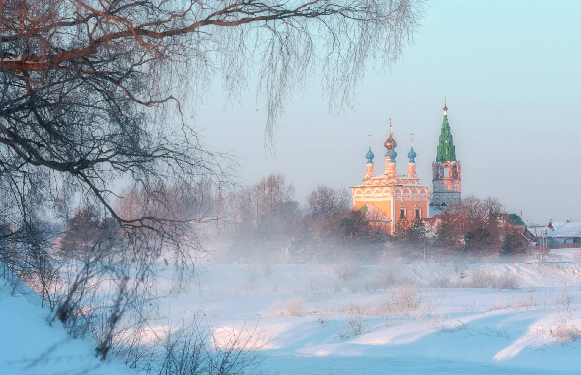 Слева композицию обрамляет одинокое дерево с тонкими, устремлёнными в небо ветвями, что символично подчёркивает устремлённость человеческой души к горнему миру в суровых условиях земного бытия. Архитектурный ансамбль представляет собой прекрасный образец русского церковного зодчества, доминирующий в заснеженной округе.