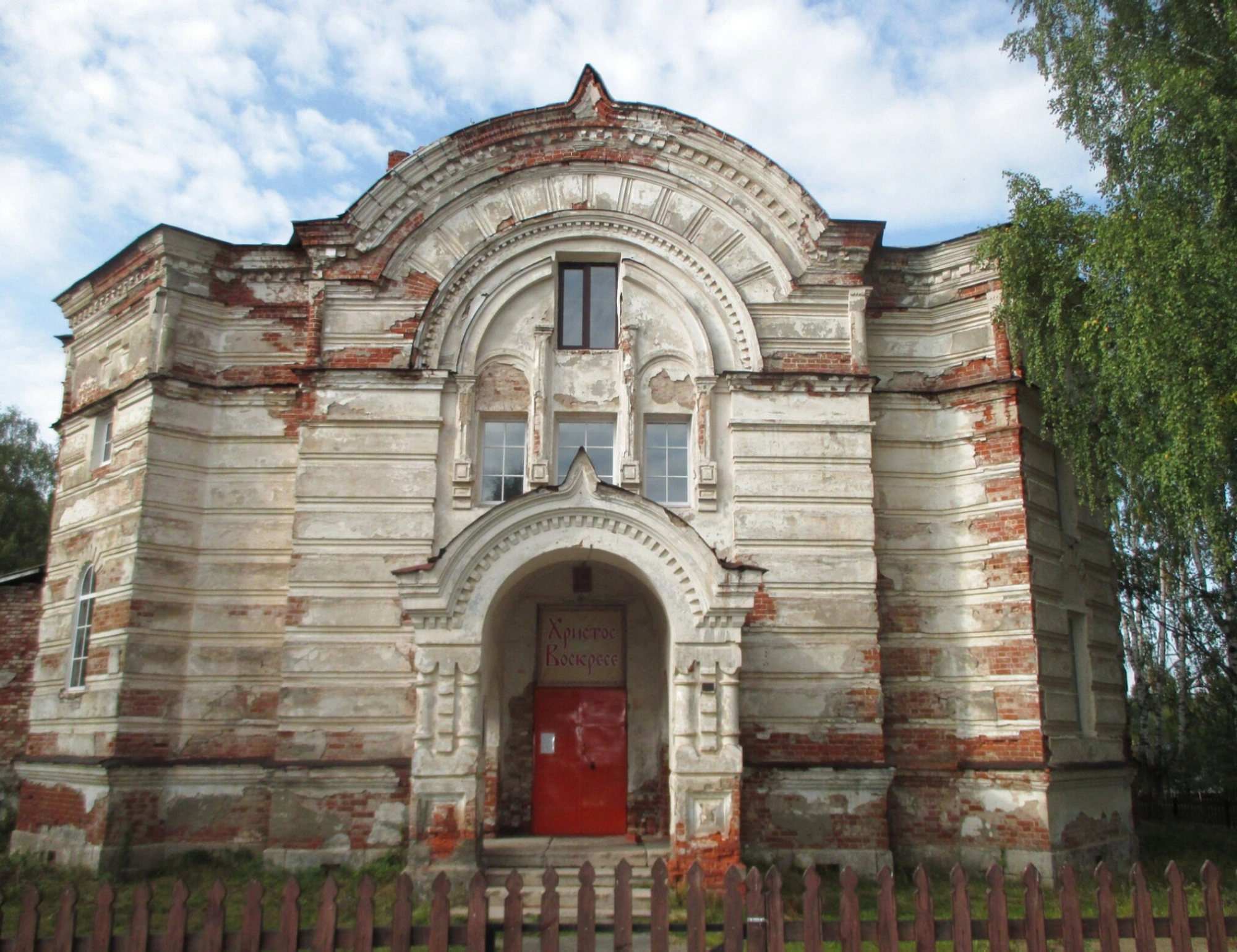 При внимательном рассмотрении фотографии отмечаются признаки естественного старения сооружения: на отдельных участках фасада штукатурный слой частично утрачен, обнажая добротную кирпичную кладку. Это придаёт храму особую атмосферу духовной преемственности и исторической достоверности.