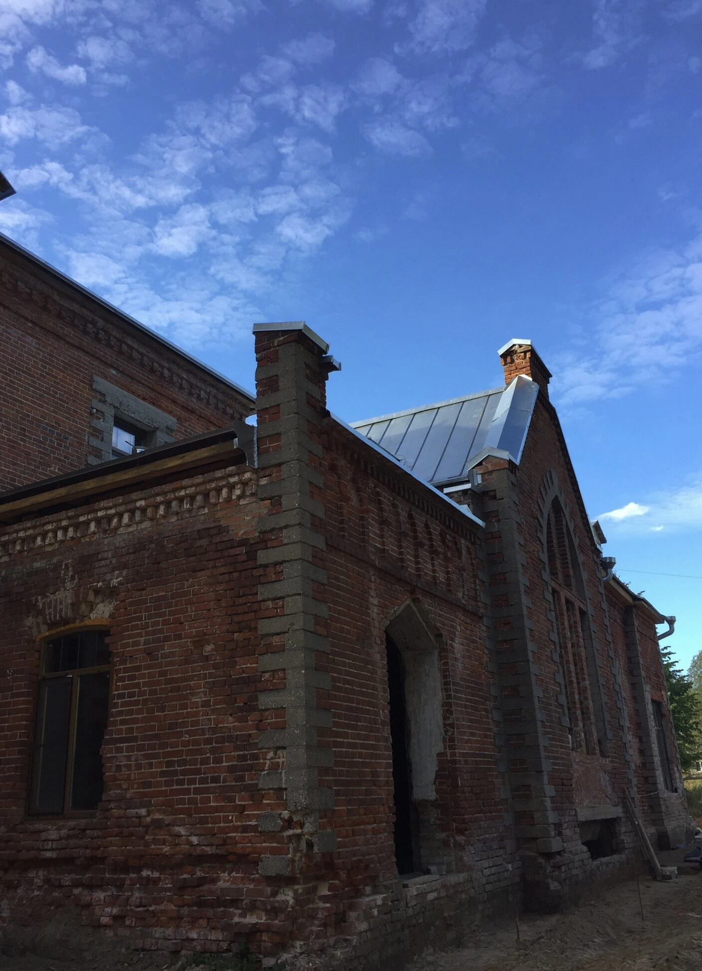 Кровля храма частично покрыта металлическим листом, вероятно оцинкованным, что свидетельствует о более поздних ремонтных работах. На снимке заметны признаки ветхости строения: в арочном оконном проёме отсутствуют рамы, что указывает на необходимость реставрационных работ.