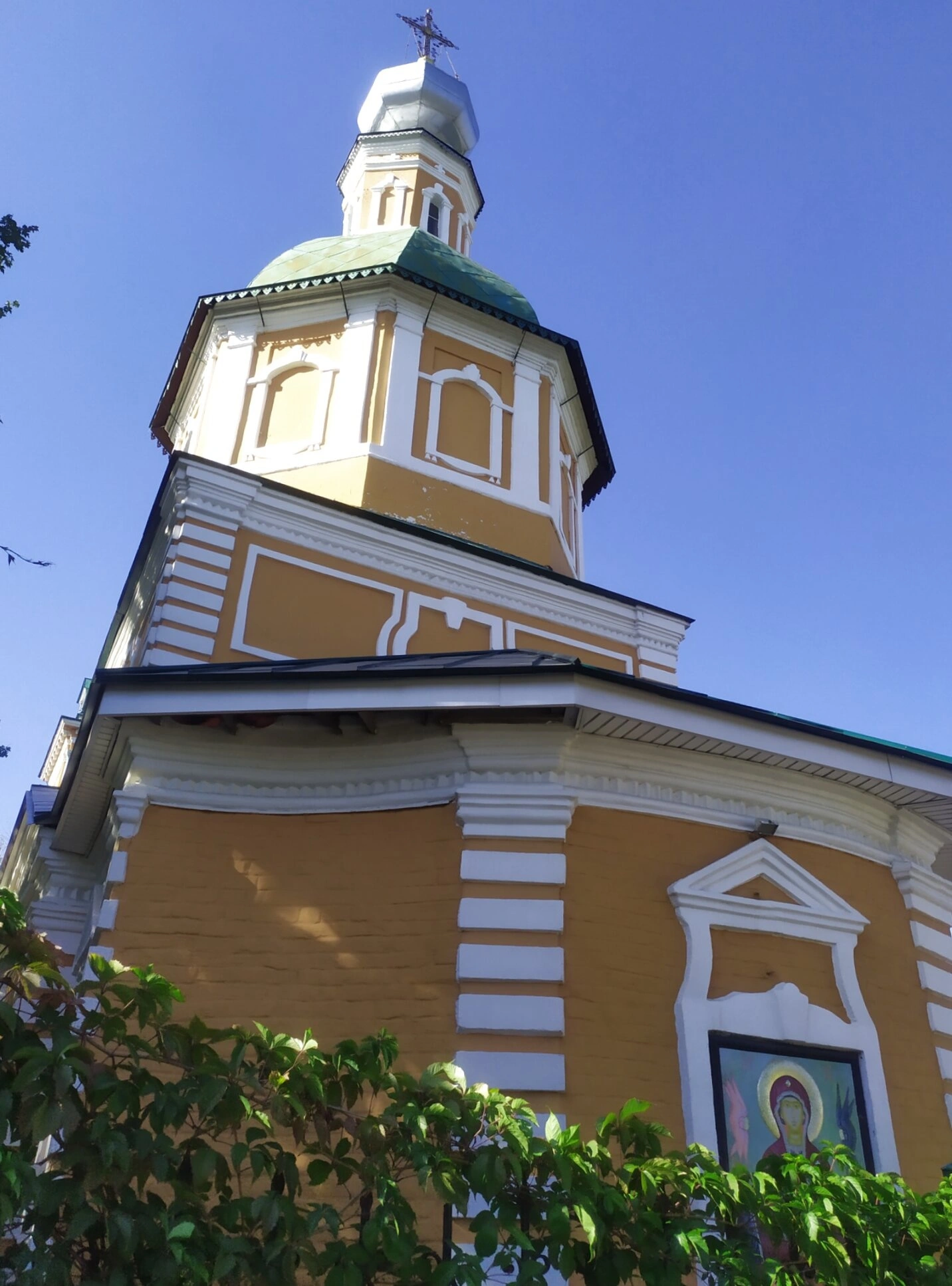 На заднем плане возвышается колокольня храма, увенчанная куполом с православным крестом, символизирующим победу жизни над смертью. По сторонам от храма видны ветви деревьев с пышной зелёной листвой, свидетельствующие о том, что фотография сделана в тёплое время года. Чистое голубое небо на заднем плане подчёркивает благолепие всего архитектурного ансамбля.