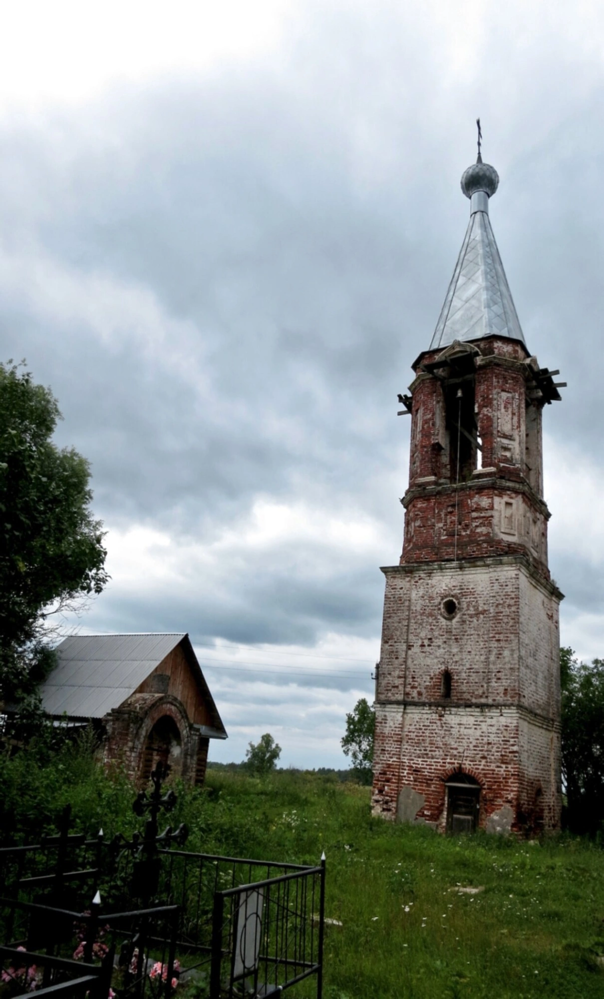 Колокольня, выполненная из красного кирпича, dominates композицией. Её конструкции подверглись значительному выветриванию и осыпанию, что придает сооружению особый исторический шарм. В верхнем ярусе сохранились арочные проемы, где ранее размещались церковные колокола. Венчает колокольню шатровый купол с установленным православным крестом, который также показывает признаки временного разрушения.