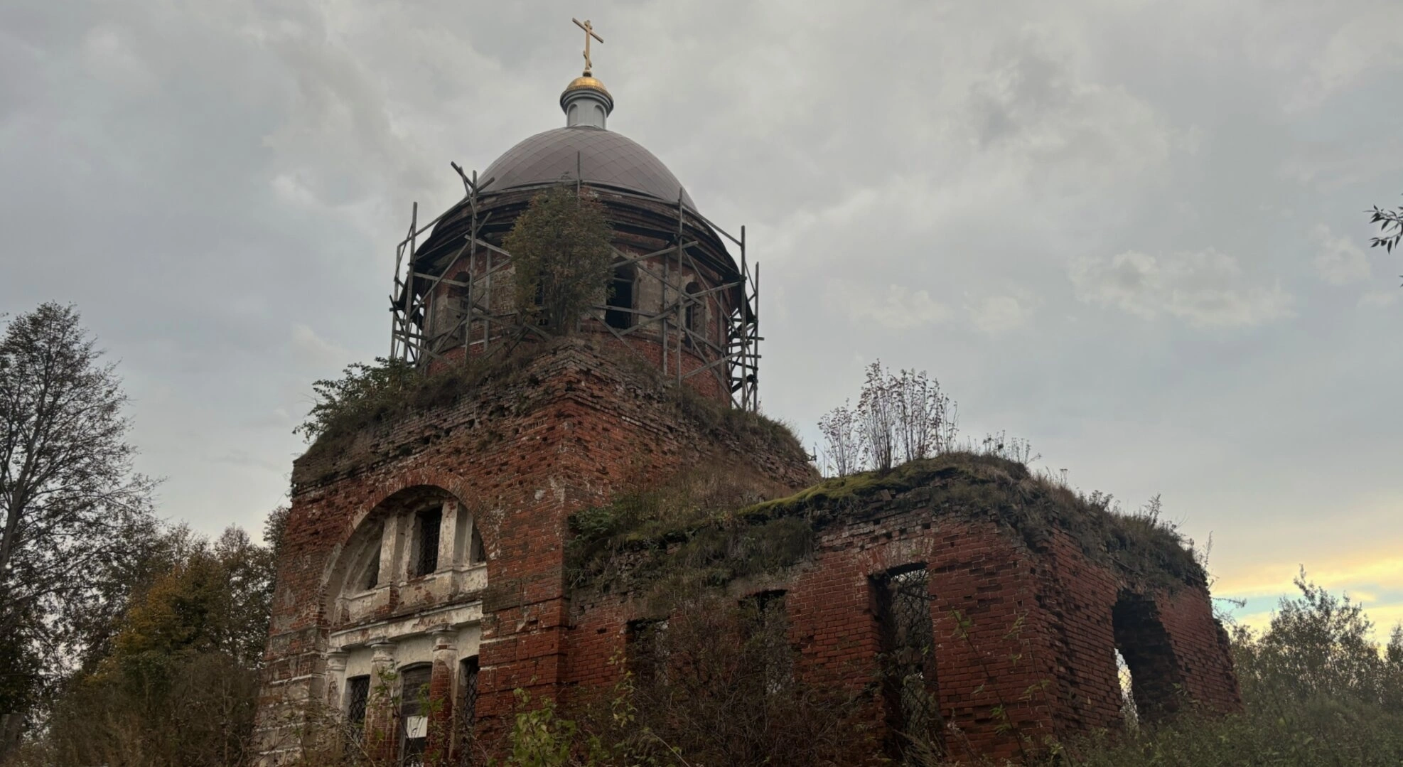 На представленной фотографии запечатлена Церковь Рождества Пресвятой Богородицы, расположенная в селе Мишутино Сергиево-Посадского района Московской области. Храм находится в полуразрушенном состоянии, что свидетельствует о длительном периоде забвения этого святого места.