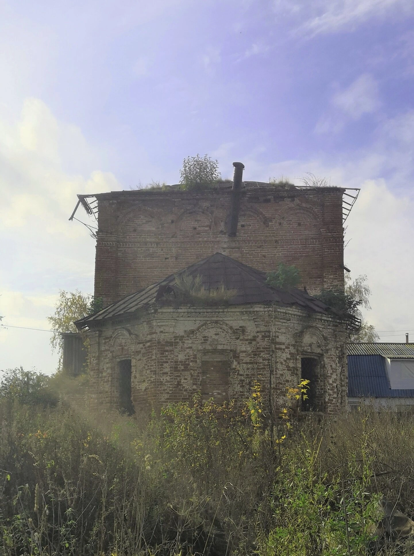 К сожалению, в настоящее время храм пребывает в полуразрушенном состоянии. На фотографии отчетливо видны следы длительного запустения: повреждения кровли, утрата отдельных архитектурных деталей, общее обветшание конструкций. Активная растительность, покрывающая стены и крышу здания, подчеркивает годы забвения этого некогда благолепного дома Божиего.