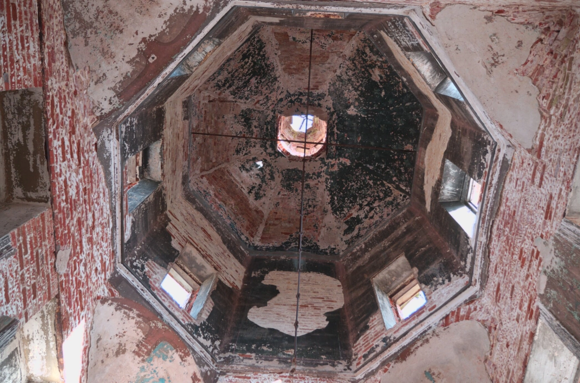 Состояние интерьера свидетельствует о сложной истории храма в XX столетии. После закрытия в годы гонений и разбора трапезной с Варваринским приделом, а также отдельно стоящей шатровой колокольни, здание десятилетиями пребывало в заброшенном состоянии. На снимке видны следы разрушительного воздействия времени и стихии: осыпавшаяся штукатурка, обнажившая кирпичную кладку, следы протечек на сводах. Естественный свет проникает через арочные оконные проемы, характерные для яруса восьмерика, и частичные разрушения кровли, создавая особую атмосферу утраты и величия.