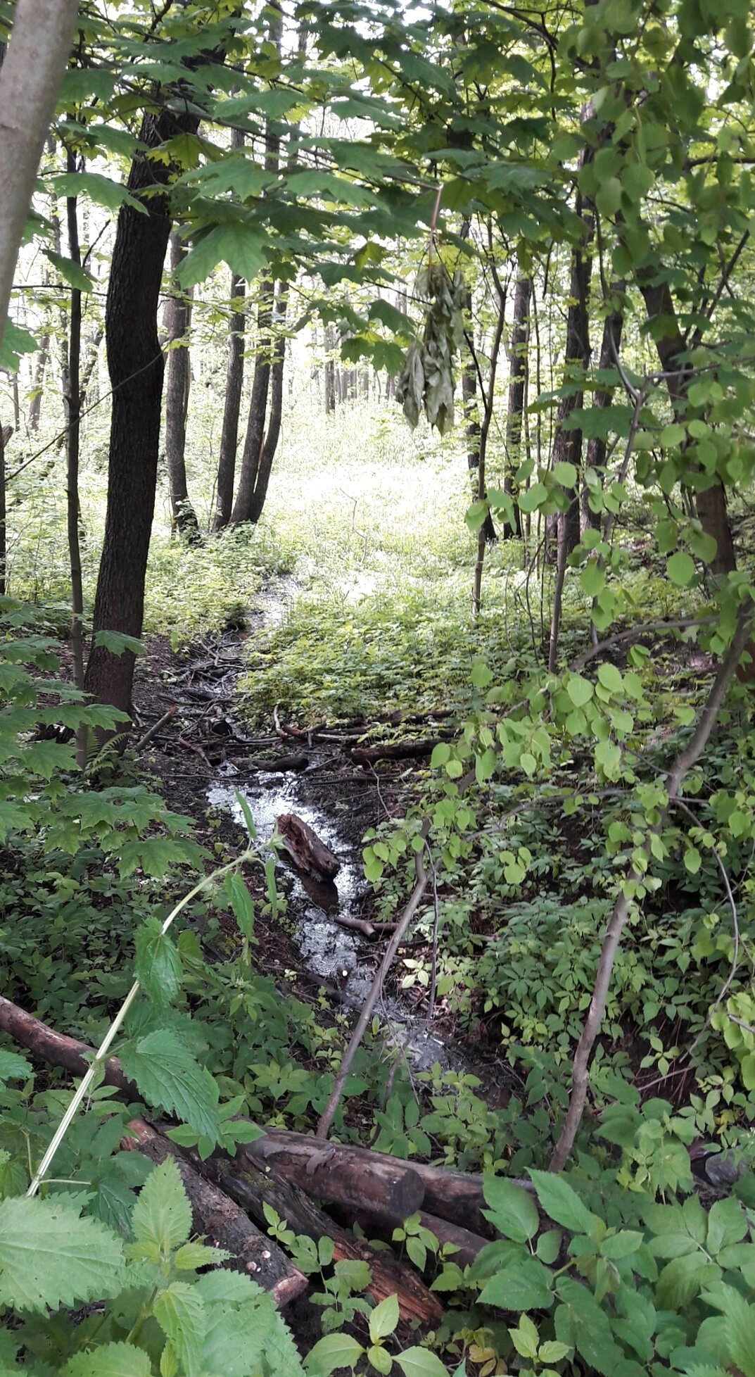 Справа от тропинки заметен небольшой водоем с болотистыми берегами, окруженный естественными лесными элементами - упавшими ветками и стволами деревьев. Эта деталь добавляет пейзажу естественности и природной гармонии.