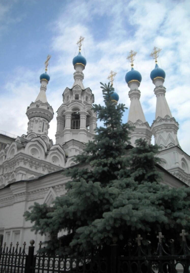 На представленной фотографии запечатлена Церковь Рождества Пресвятой Богородицы в Путинках — выдающийся памятник русского церковного зодчества середины XVII века. Храм расположен в историческом центре Москвы, неподалёку от площади Тверская Застава, что подтверждается географическими координатами снимка.