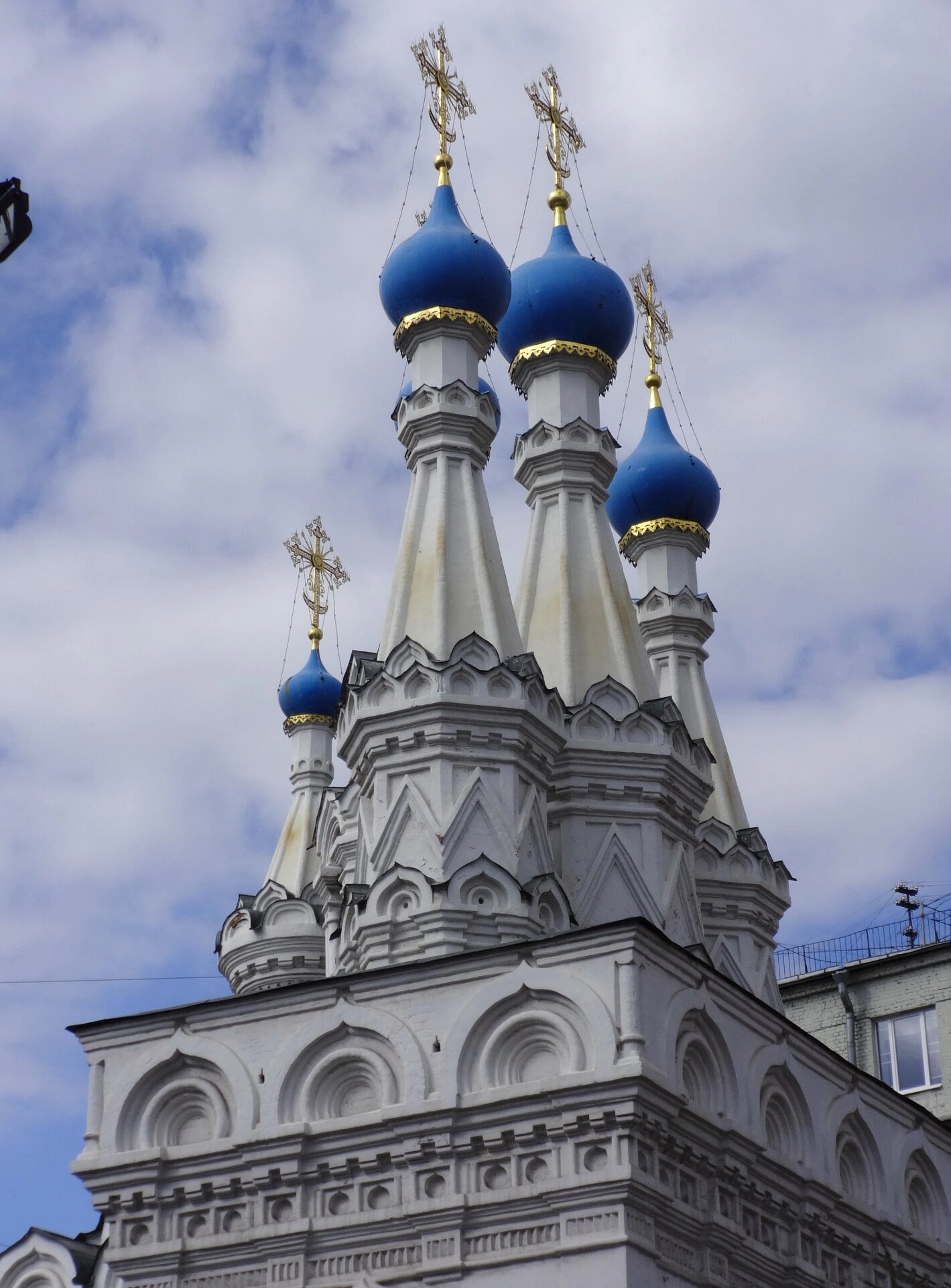 На представленной фотографии запечатлён выдающийся памятник русского церковного зодчества — храм Рождества Пресвятой Богородицы в Путинках, расположенный в историческом центре Москвы. Снимок выполнен с нижнего ракурса, что позволяет в полной мере оценить величественность сооружения и изящество его архитектурных форм.