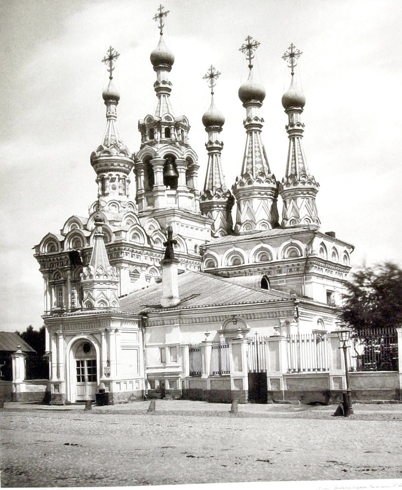На фотографии можно наблюдеть первоначальный облик святыни с характерными шатровыми завершениями и богатым кирпичным декором. Особенностью данного снимка является документальная фиксация исторического вида храма до последующих перестроек и реставрационных работ.