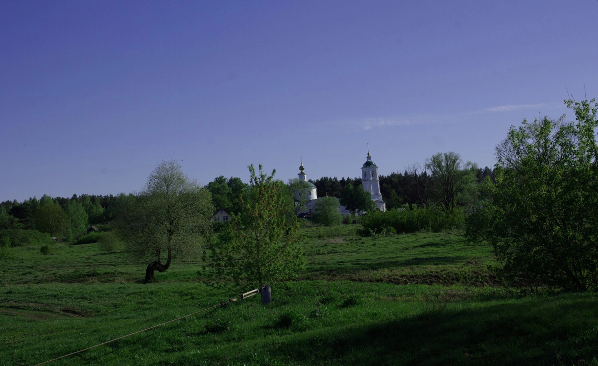 Белоснежные стены церкви и колокольни символически отражают чистоту и духовную благодать, в то время как зеленые купола и кровля, традиционные для православного зодчества, олицетворяют вечную жизнь и надежду. На переднем плане изображена зеленая поляна с отдельно стоящими деревьями, одно из которых имеет характерный изогнутый ствол, добавляющий пейзажу естественности и очарования.
