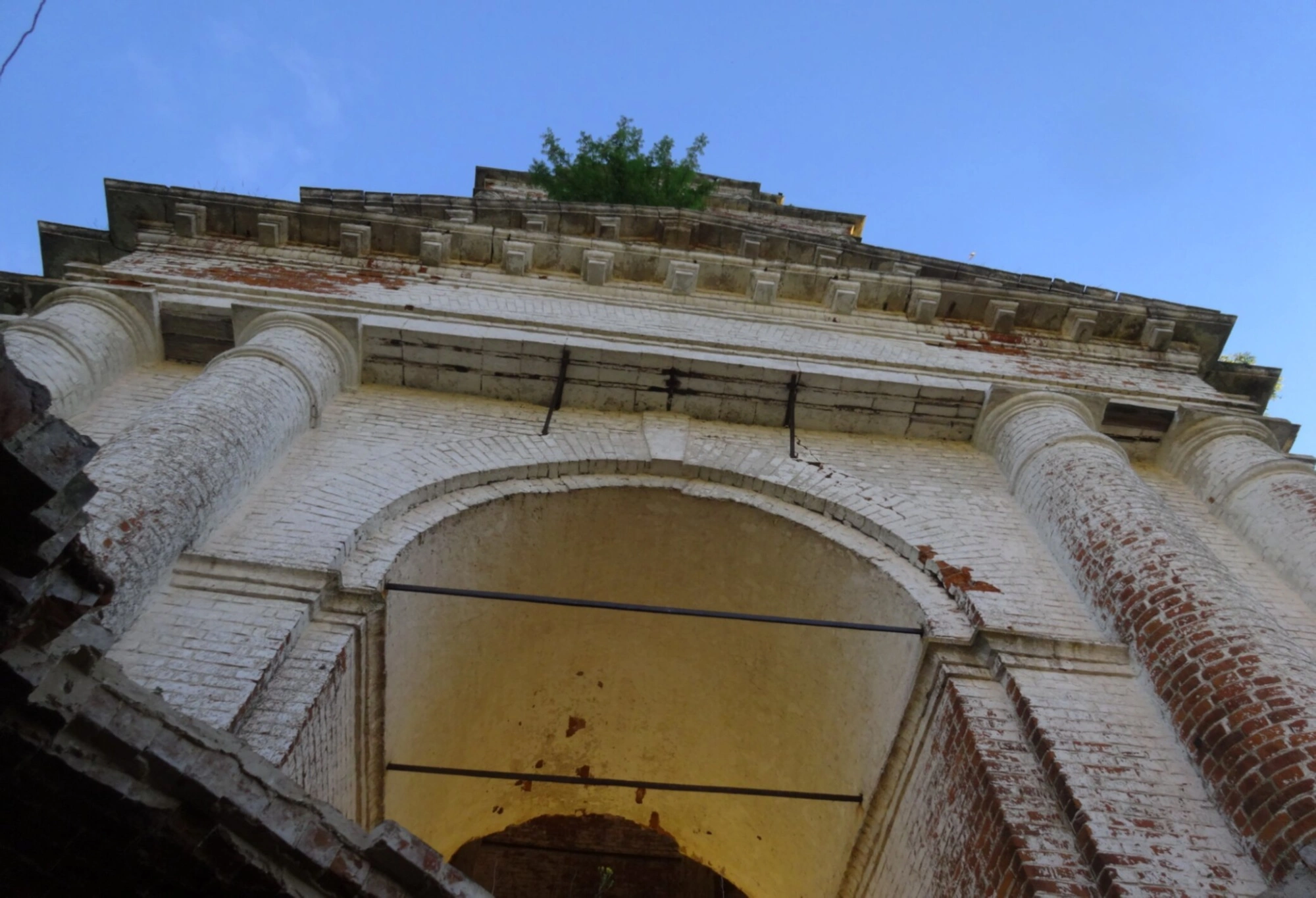 На снимке отчетливо просматривается верхний ярус церковного фасада, выполненный в традициях классицизма. В центральной части композиции возвышается монументальная полукруглая арка, обрамляющая вход в храмовое пространство. По сторонам арки расположены массивные колонны с выразительными капителями, поддерживающие строгий антаблемент, характерный для классического архитектурного канона.
