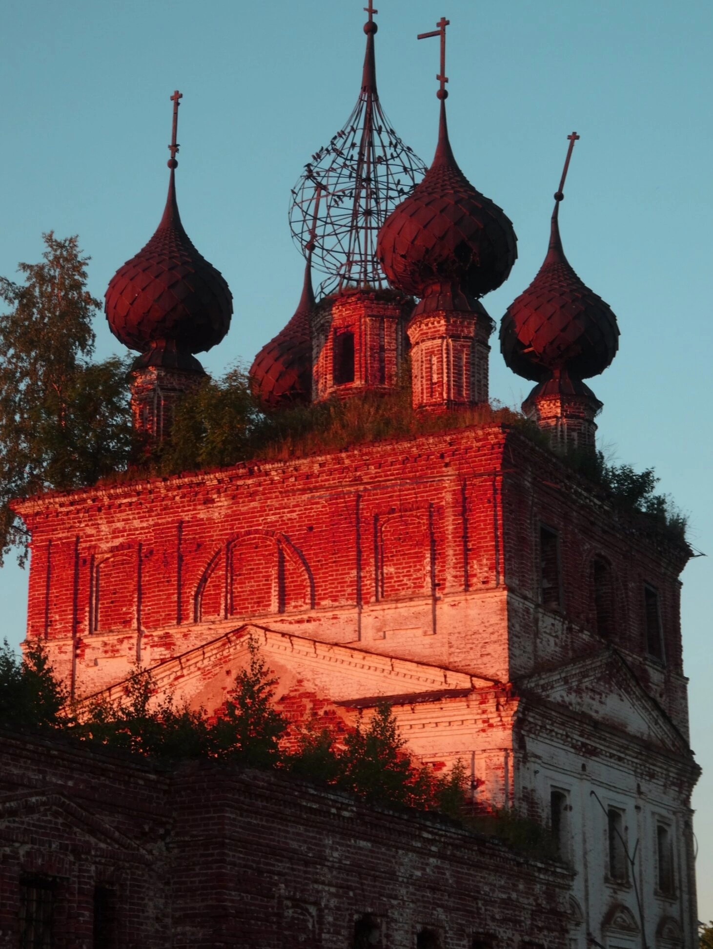 Несколько куполов, венчающих храм, имеют характерную для православного зодчества луковичную форму. Несмотря на запустение, угадываются элементы традиционного церковного устройства: возможно, основной объём храма и колокольня. Солнечный свет, падающий на фасад, мягко высвечивает фактуру кирпичной кладки и подчёркивает строгие линии архитектуры, создавая одновременно печальное и возвышенное зрелище.