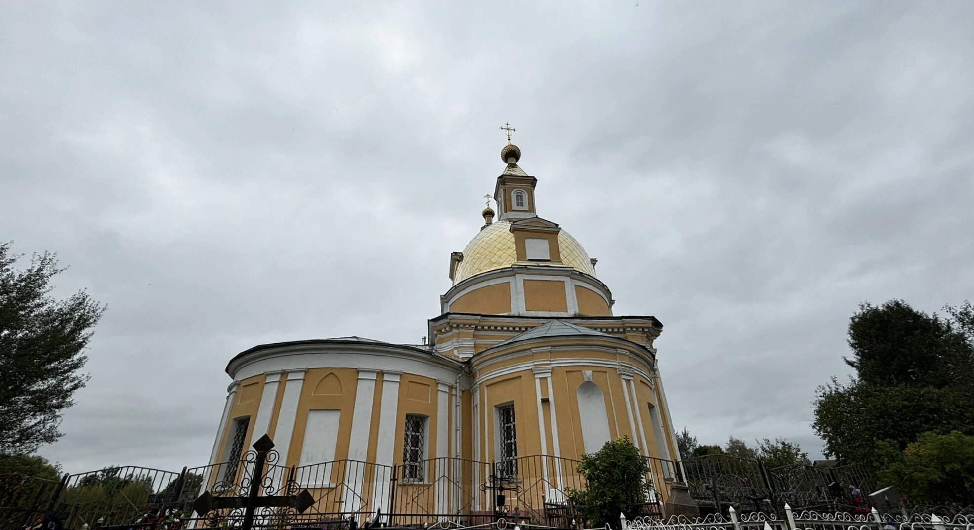 Церковь окружена металлической оградой, за которой виднеются надгробия прицерковного кладбища. Это свидетельствует о древности храма и его неразрывной связи с историей местного прихода. Деревья, окружающие здание, создают естественное обрамление и подчёркивают гармонию архитектуры с природным окружением.