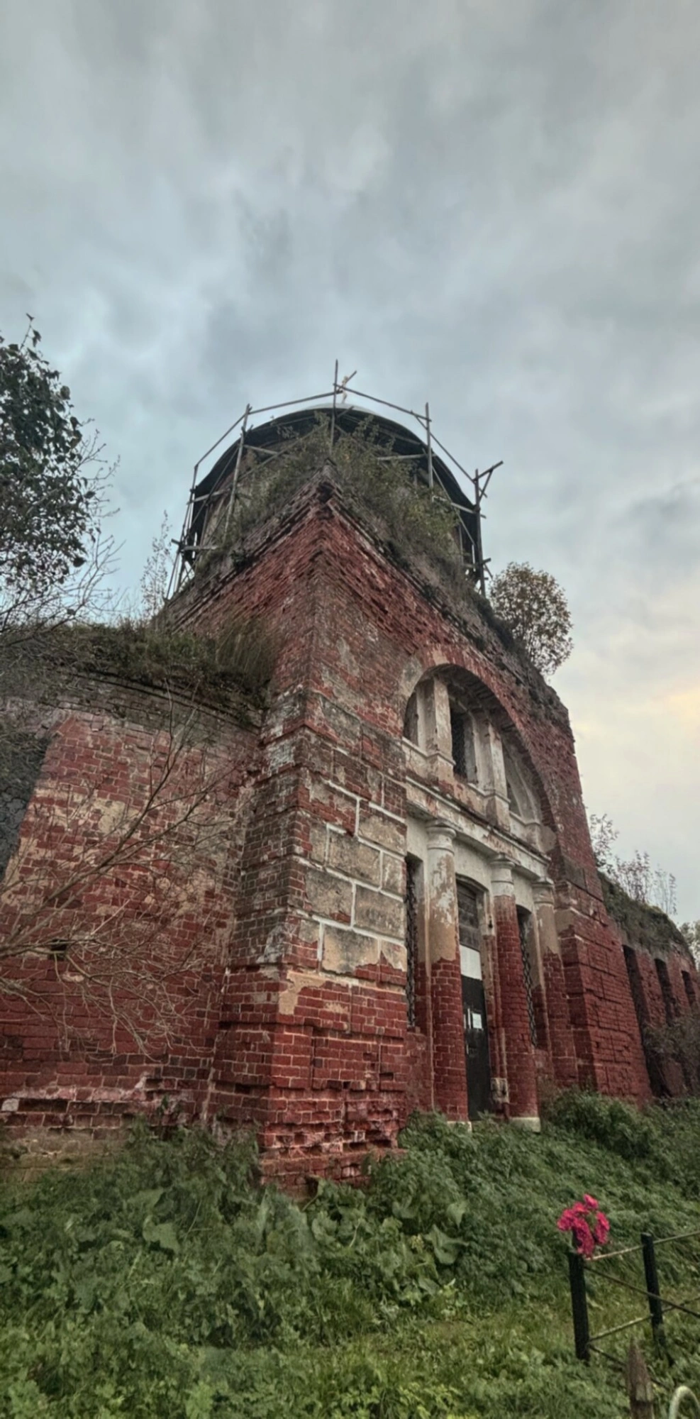 Примечательной деталью являются металлические строительные леса, установленные вокруг основания купола. Это говорит о предпринимавшихся попытках реставрационных работ или консервации памятника церковной архитектуры. Окружающий ландшафт характеризуется высокой травой и естественной растительностью, на переднем плане различим фрагмент ограды с декоративными красными цветами.