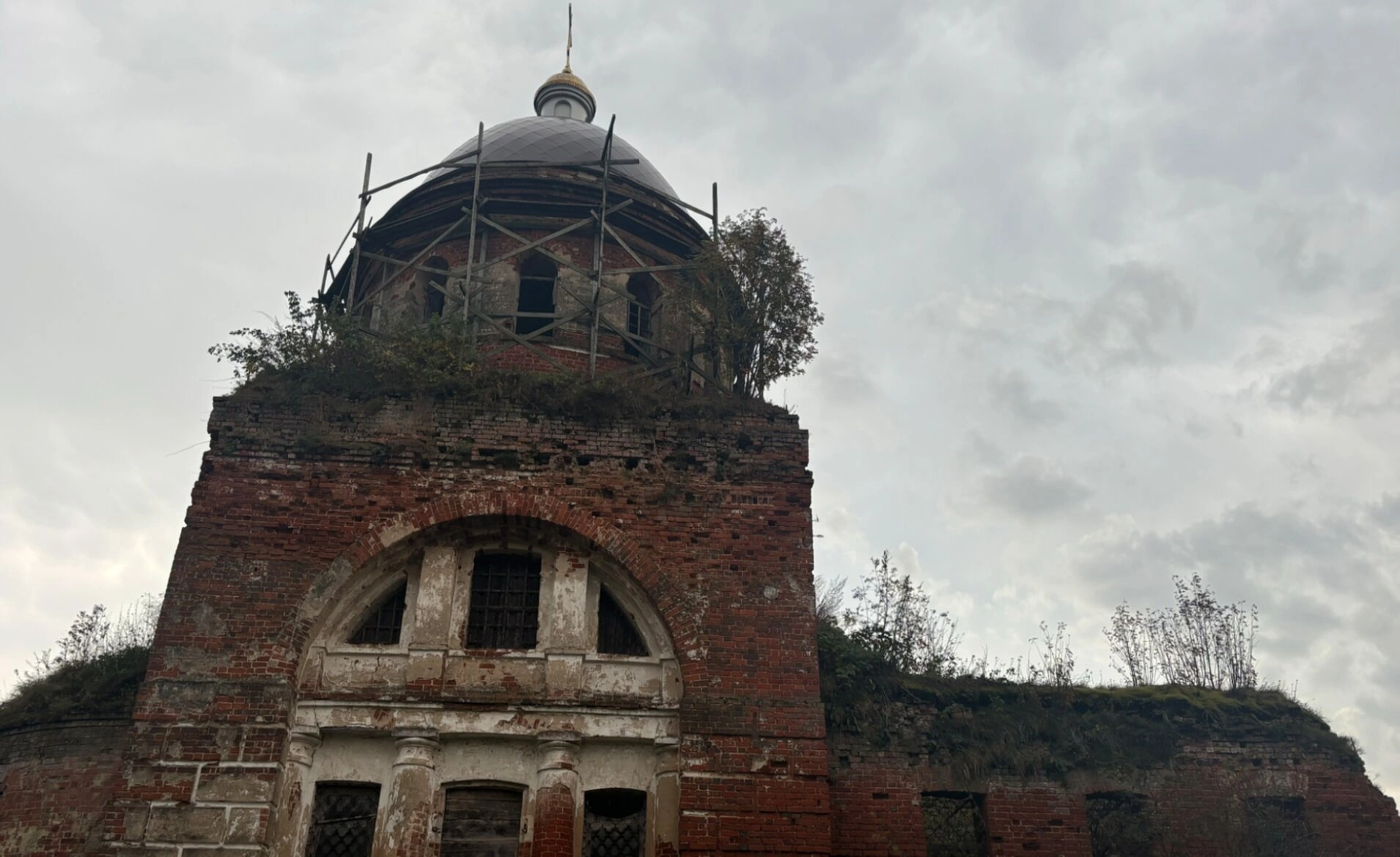 При внимательном рассмотрении фотографии отмечается, что церковь пребывает в состоянии запустения. Стены храма частично скрыты разросшейся древесной растительностью, что свидетельствует о длительном отсутствии полноценного ухода. На куполе просматриваются элементы строительных лесов, которые могут указывать на предпринимавшиеся в прошлом попытки ремонтных или реставрационных работ, оставшиеся незавершёнными.