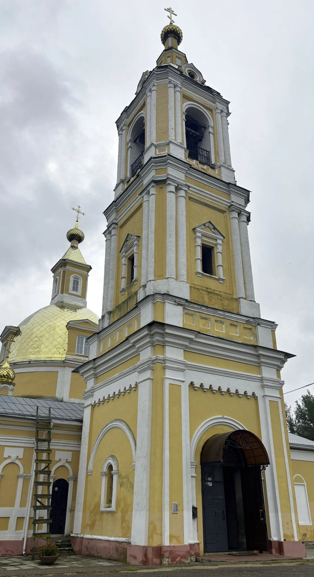 Над основной частью храмового здания возвышается главный купол, покрытый позолотой и увенчанный крестом. Фасад церкви отличается гармоничным сочетанием желтого фона и белых архитектурных деталей, включая пилястры и наличники, характерные для русского церковного зодчества.