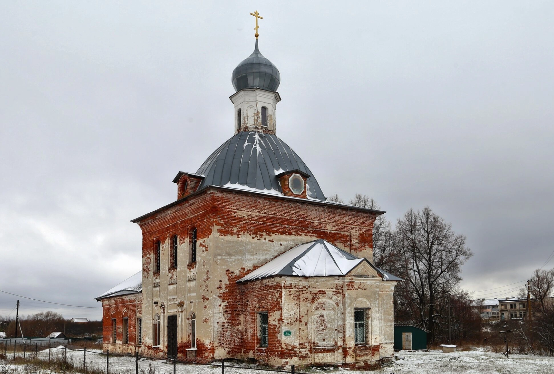 При внимательном рассмотрении фотографии становится очевидным нынешнее состояние святыни. Храм пребывает в запустении: кирпичная кладка местами повреждена, штукатурный слой частично утрачен, что свидетельствует о длительном отсутствии реставрационных работ. Зимний пейзаж, запечатлённый на снимке, подчёркивает особую атмосферу благоговейной тишины и уединённости, окружающую этот памятник православного зодчества.