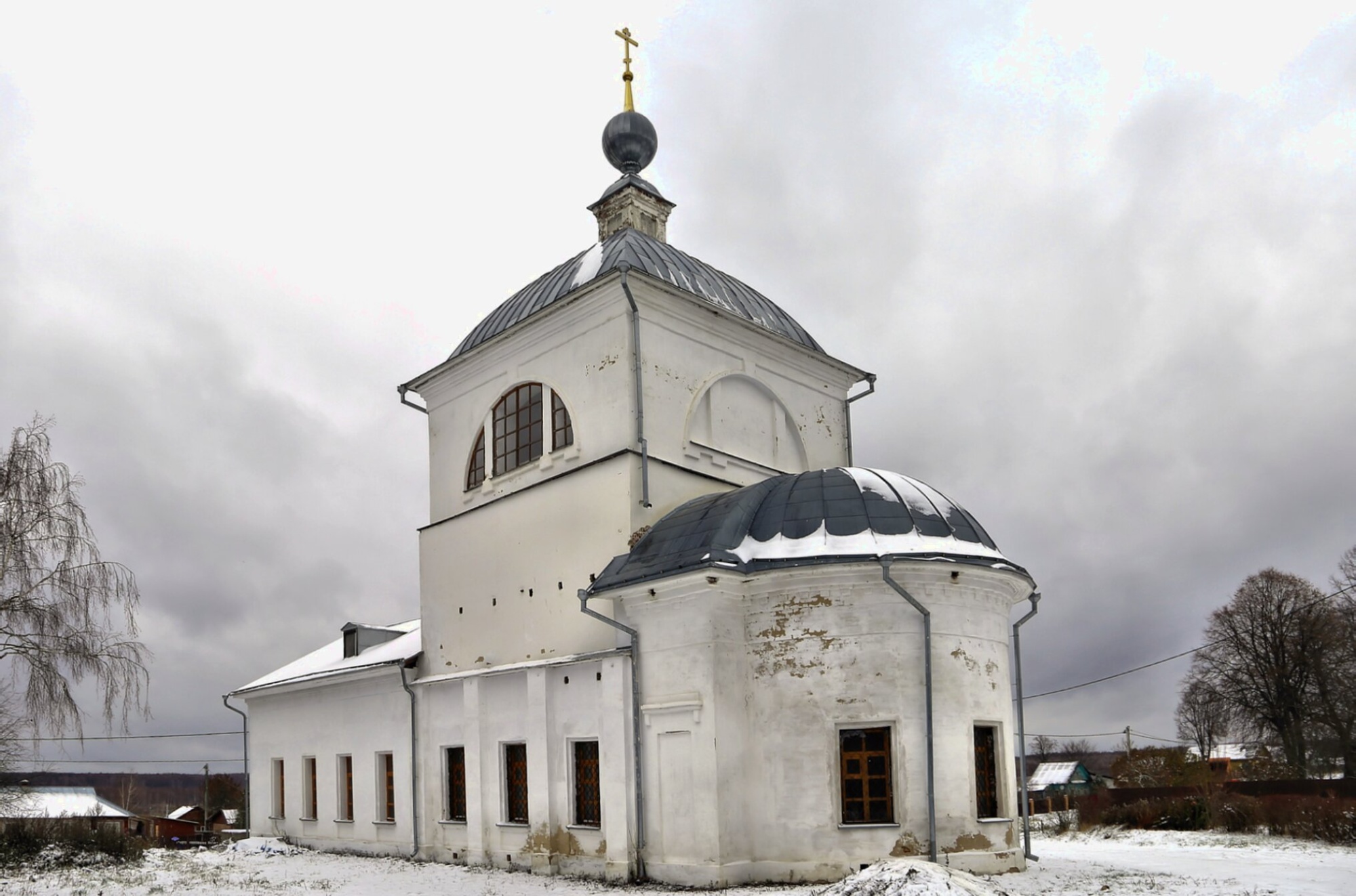 Храмовая территория обнесена оградой, сочетающей кирпичное основание и ажурные металлические решетки зеленого цвета. В непосредственной близости от церкви виднеются деревянные хозяйственные постройки, характерные для русских сел. Зимний пейзаж добавляет фотографии особое настроение: тонкий снежный покров укрывает землю, а пасмурное небо с низкими облаками создает атмосферу тишины и умиротворения, столь свойственную православным святыням.
