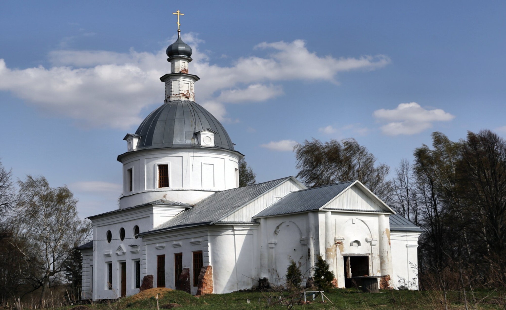Храм расположен на живописном возвышении, окруженный древесной растительностью. Прилегающая территория заросла травой, что подчеркивает заброшенность этого некогда благодатного места. На заднем плане просматривается светлое небо с облачными образованиями, создающее контраст с печальным состоянием архитектурного памятника.