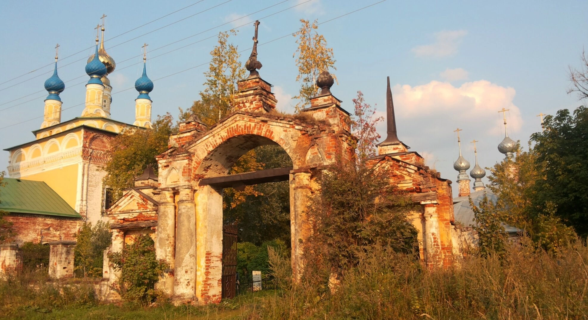 На переднем плане фотографии видны полуразрушенные кирпичные ворота, ведущие на территорию церковного подворья. Эти ворота, сохранившие следы времени, представляют историческую ценность и являются немыми свидетелями разных эпох в жизни храма.