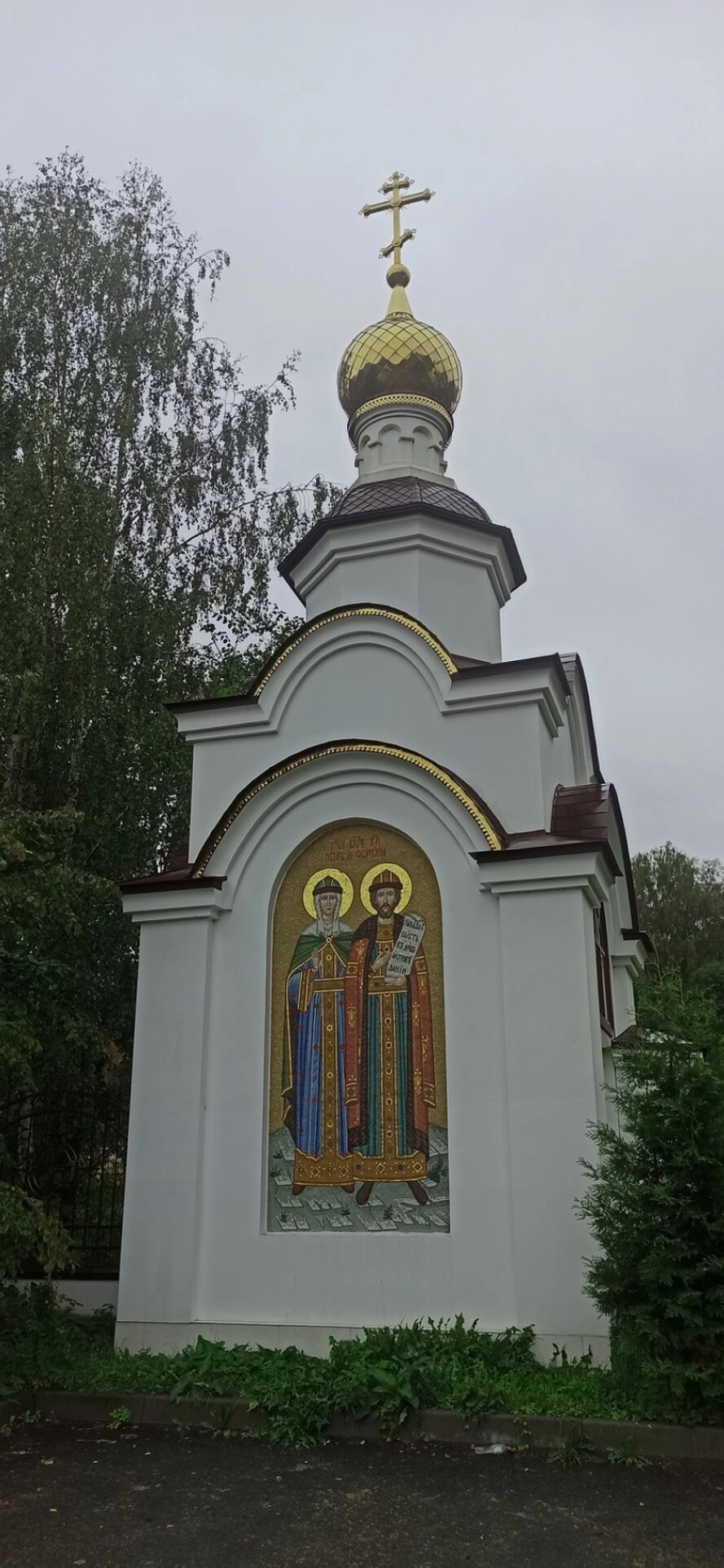 Внешний облик храма характеризуется строгими белыми стенами, увенчанными позолоченным куполом с возвышающимся крестом. На одной из внешних стен расположено мозаичное изображение двух святых, облаченных в традиционные одеяния и держащих в руках священные свитки или книги. Этот декоративный элемент подчеркивает сакральное назначение сооружения и его богатую духовную историю.