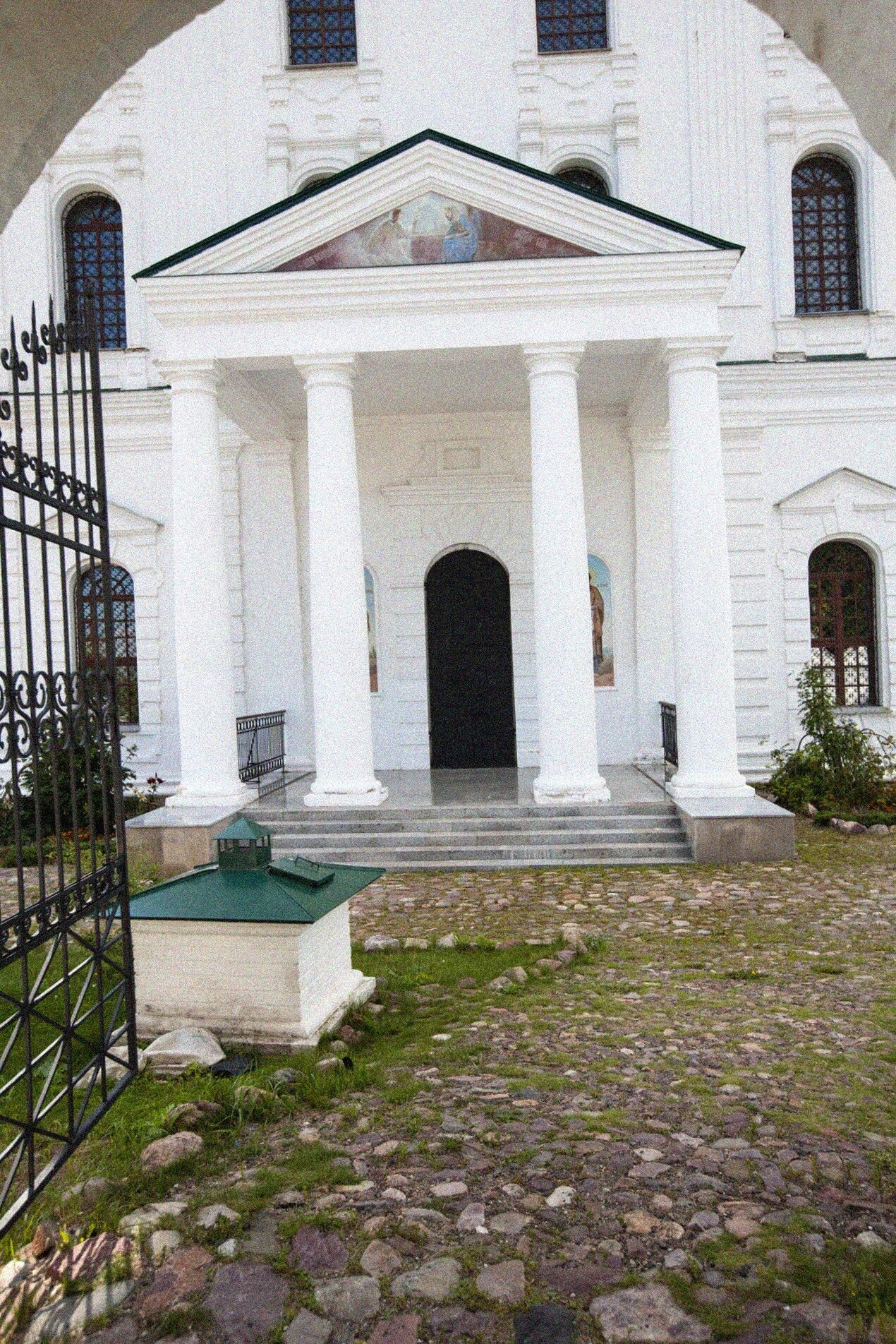 По обе стороны от входа симметрично расположены арочные оконные проёмы, защищённые коваными решётками. Слева от храма видна ажурная металлическая ограда с калиткой, а также часть здания с зелёной кровлей, вероятно, относящегося к церковному подворью. Перед храмом пролегает мощёная булыжником дорожка, ведущая к святому входу.