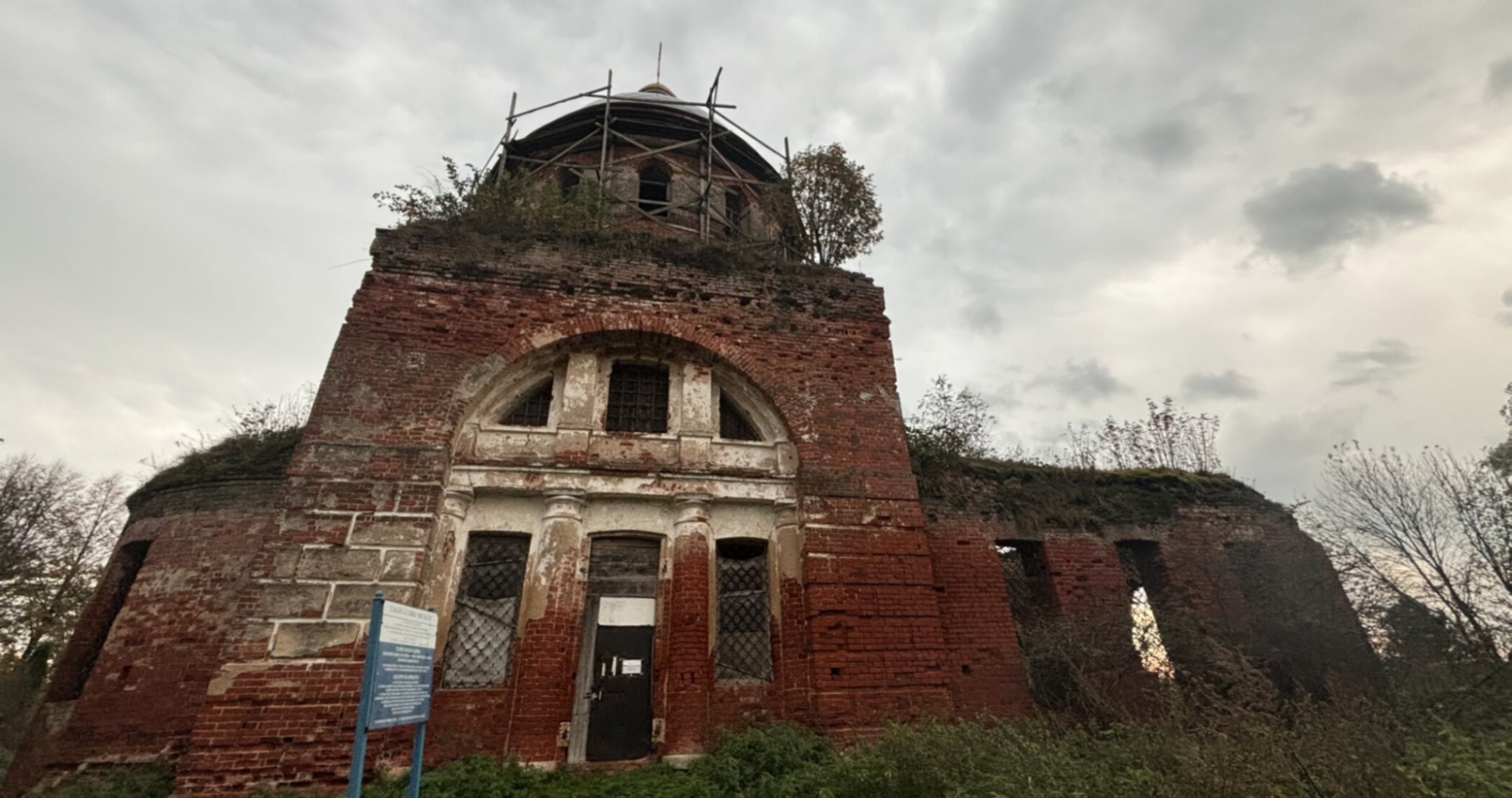Особую тревогу вызывает состояние верхней части храма. Барабан купола значительно поврежден, однако присутствие строительных лесов вокруг него свидетельствует о начатых работах по консервации или реставрации. На стенах и куполе заметна проросшая растительность, что дополнительно подчеркивает необходимость срочных мер по сохранению памятника.