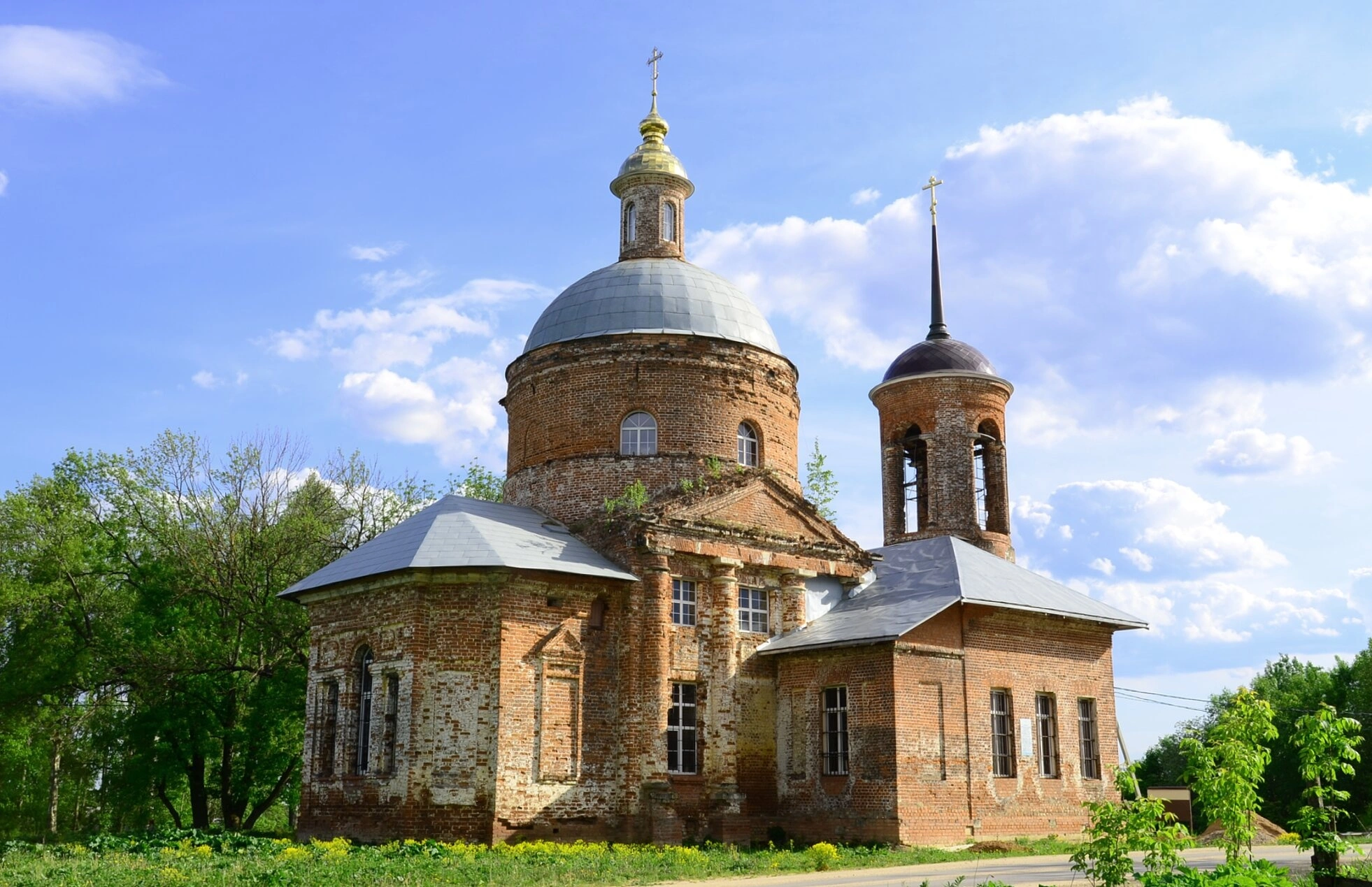 Храмовой комплекс состоит из основного объема, увенчанного массивным куполом с золоченым крестом, и примыкающей к нему колокольни, завершающейся высоким шпилем. Здание сооружено из кирпича с использованием традиционных приемов русского церковного зодчества. На момент съемки храм находится в состоянии, требующем реставрационных работ: наблюдаются повреждения кирпичной кладки, утраты штукатурного слоя, на поверхностях стен и кровли просматривается произрастающая растительность.