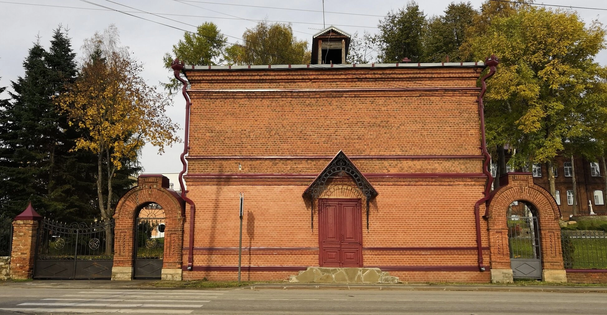 Крыша храма, предположительно покрытая металлом, включает небольшой чердачный проем. По периметру кровли установлена водосточная система, выполненная в едином стиле с основным сооружением. По бокам от церковного здания расположены кирпичные арки с художественно выполненными коваными металлическими воротами и калиткой, образующие целостный архитектурный комплекс.