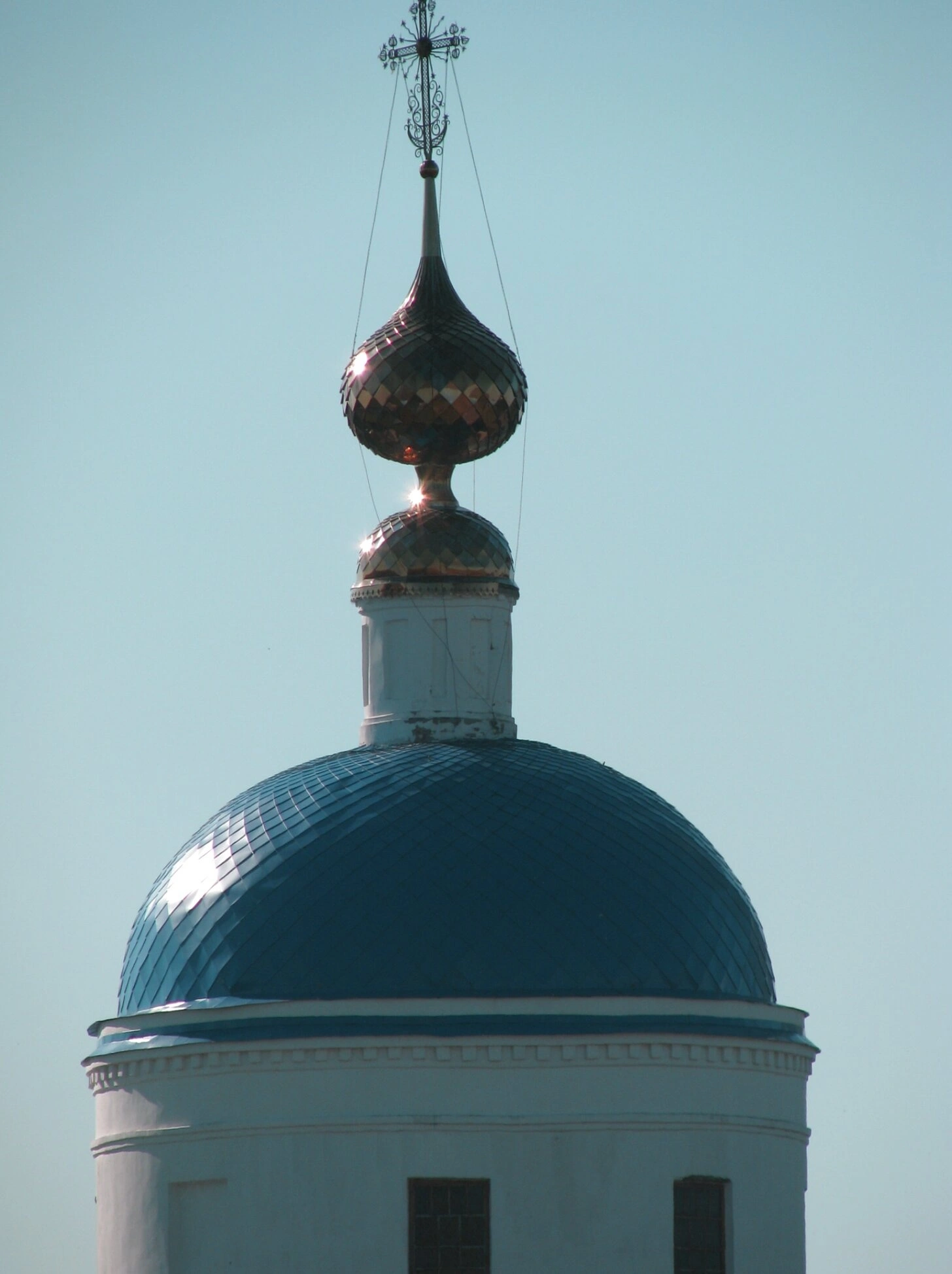 На представленной фотографии запечатлён величественный образ Церкви Рождества Пресвятой Богородицы, что расположена в старинном селе Подолец Суздальского района Владимирской области. Снимок запечатлевает фрагмент храмовой архитектуры: синий купол, увенчанный злаченой главкой с водружённым на ней православным крестом, и верхний ярус колокольни на фоне безмятежного голубого неба.