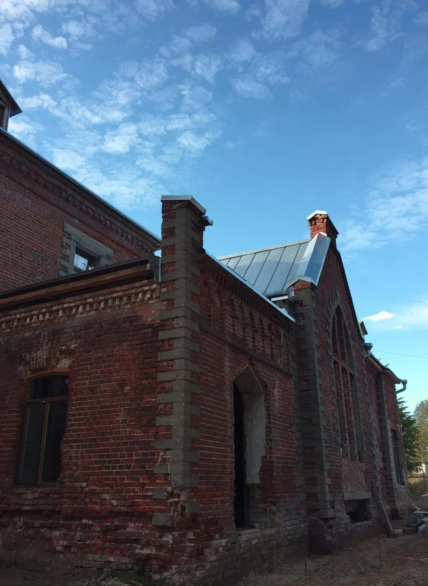К великому сожалению, в настоящее время храм пребывает в частично разрушенном состоянии. На фотографии отчетливо видны повреждения кирпичной кладки, отсутствие оконных заполнений в некоторых проемах, а также следы разрушения кровли и фасадных поверхностей. Несмотря на это, сооружение сохраняет свою архитектурную выразительность и величие, напоминая о былом духовном значении этого святого места.