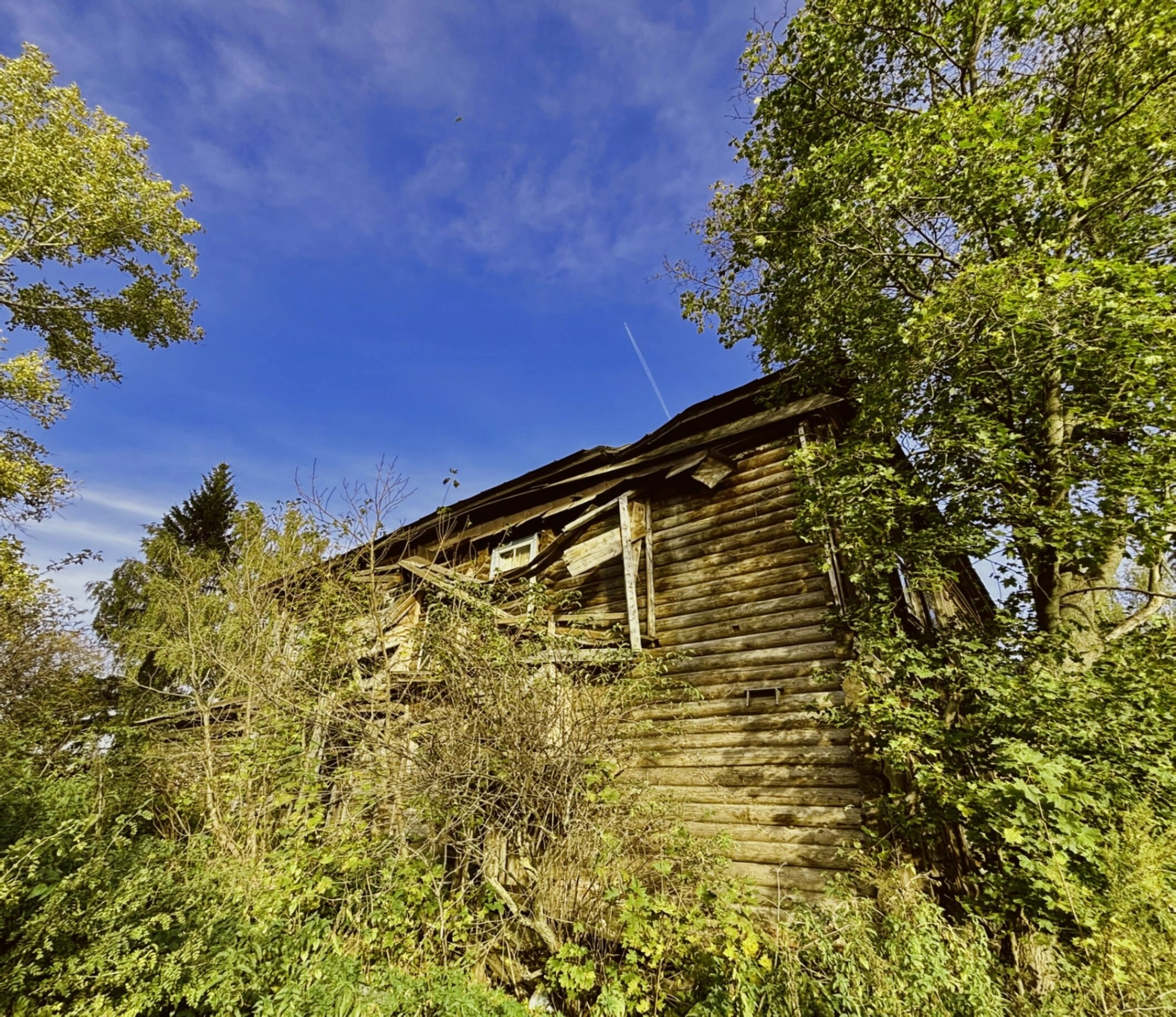 Храм окружает густая растительность — деревья и кустарники, чья осенняя листва в желтых и зеленых тонах создает контраст с темными стенами заброшенной святыни. В одной из стен просматривается фрагмент оконного проема, напоминающий о былом назначении здания. На заднем плане открывается вид на чистое голубое небо с легкими облаками, где заметен инверсионный след пролетевшего самолета.
