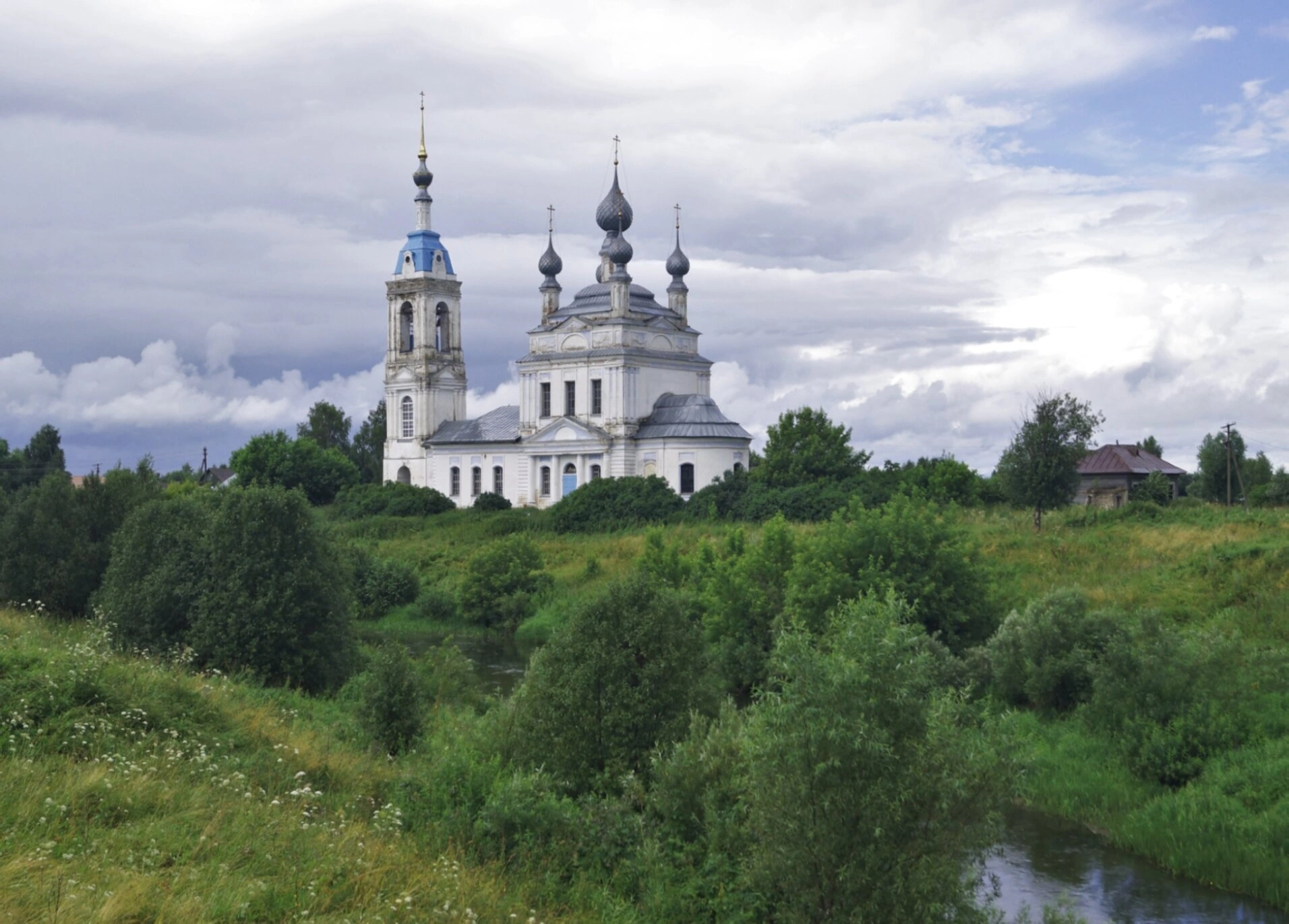 Окружающий пейзаж подчёркивает умиротворённую атмосферу этого святого места. Храм стоит в окружении lush greenery, а облачное небо над ним напоминает о вечности и бренности земного бытия. Несмотря на испытания XX века, здание сохранило свой первоначальный облик и является действующим православным приходом, привлекая как паломников, так и ценителей русской архитектуры и истории.