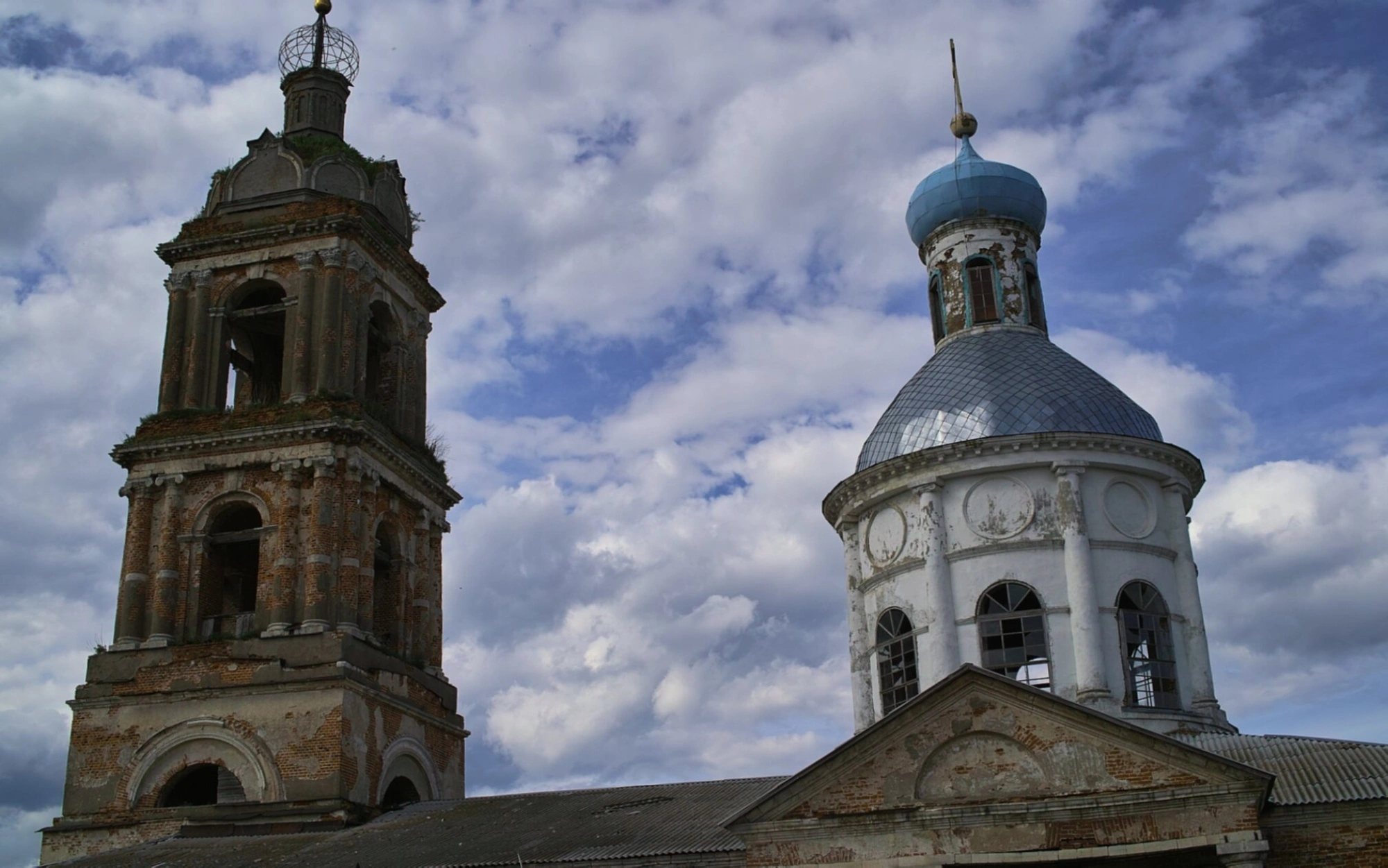 На снимке хорошо просматривается архитектурный ансамбль, состоящий из двух основных частей. Многоярусная колокольня, выполненная из красного кирпича, демонстрирует следы временного разрушения и обветшания, что придает сооружению особый исторический шарм. Основной объем храма, построенный из белого камня или оштукатуренный, отличается квадратным планом с апсидальными выступами и увенчан голубым куполом с золоченой главкой.