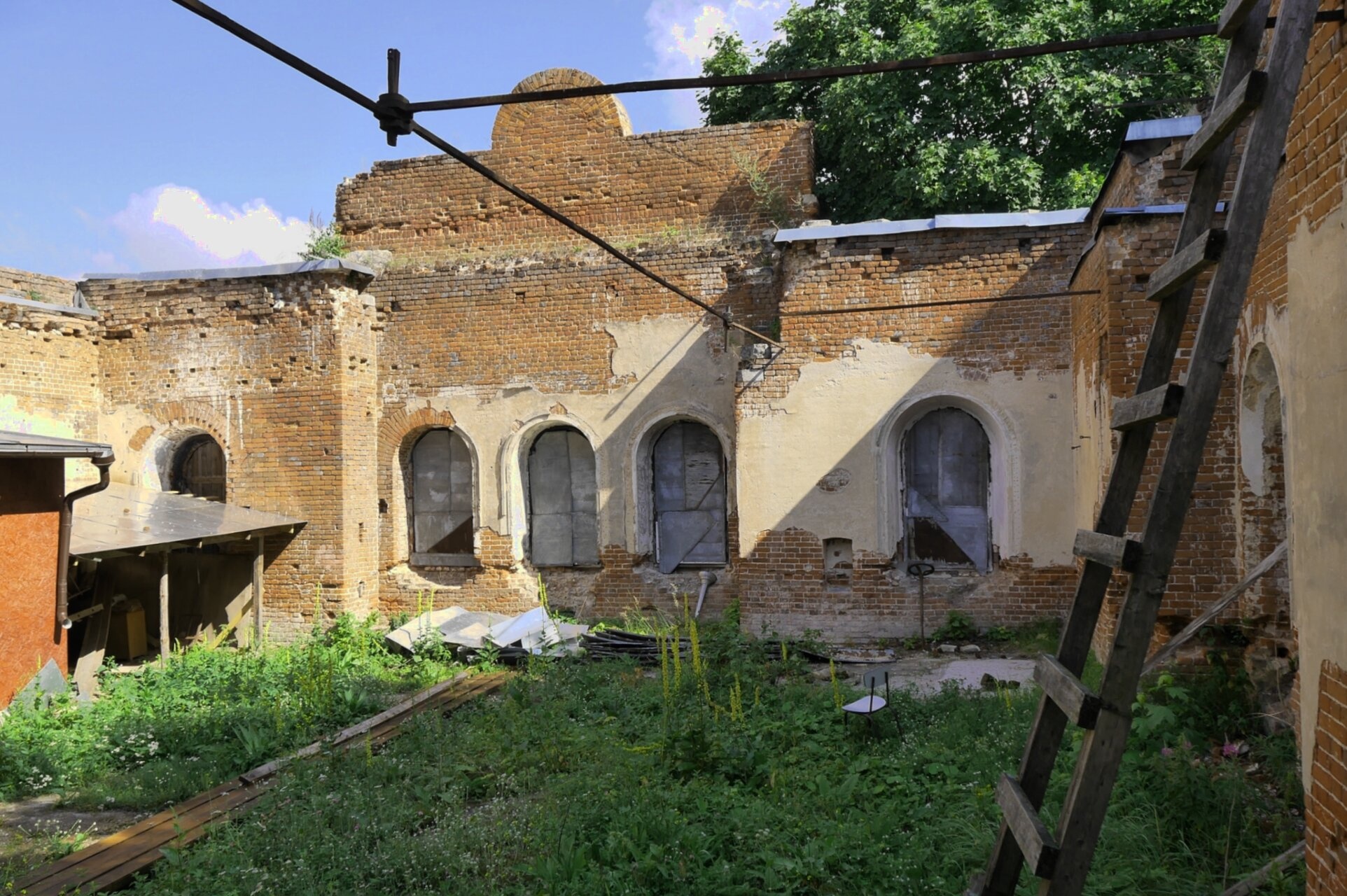 Прихрамовая территория заросла травой и кустарником, что подчёркивает заброшенное состояние объекта. С правой стороны к стене прислонена деревянная лестница, вероятно использовавшаяся для временных работ. Несмотря на частичное разрушение, сооружение сохраняет величие и духовную атмосферу, присущую православным святыням.