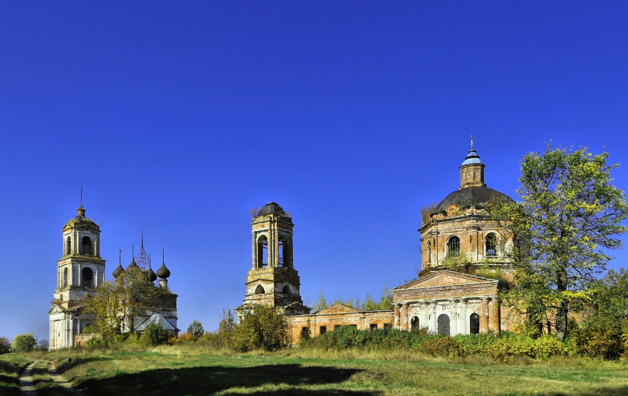 В настоящее время храм пребывает в заброшенном состоянии. На фотографии видны следы разрушения: частично утрачена штукатурка, повреждены элементы декора, купола и стены поросли растительностью. Несмотря на это, сооружение сохраняет свои архитектурные формы и величие, напоминая о былом духовном значении этого места.