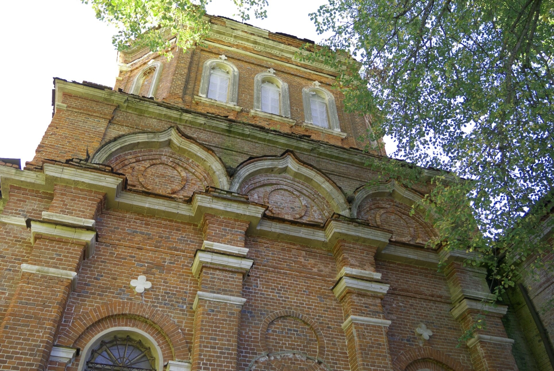 Архитектура храма демонстрирует традиционные для православного зодчества формы. Стены сложены из красного кирпича, часть которых покрыта известковой обмазкой. Фасад украшают арочные элементы и оконные проемы, обрамленные белыми наличниками, что создает благородный цветовой контраст. Подобный декор характерен для периода в русской архитектуре, следующего за эпохой барокко. Состояние здания на фотографии выдает следы времени, однако даже сквозь ветхость проступают черты былого благолепия и духовного предназначения этого места.