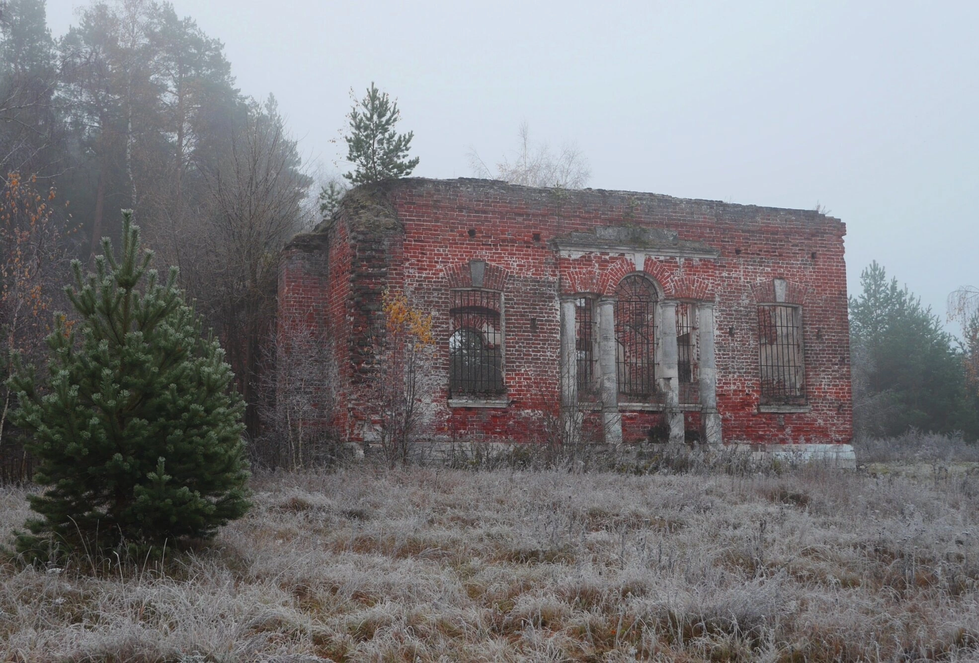 Окружающий пейзаж дополняет образ храма-мученика. Церковь возвышается на открытой местности, окруженная деревьями, а на переднем плане простирается заросшее травой поле, покрытое инеем. Эта атмосфера создает особое настроение умиротворения и светлой печали, напоминая о многовековой истории православия на русской земле.