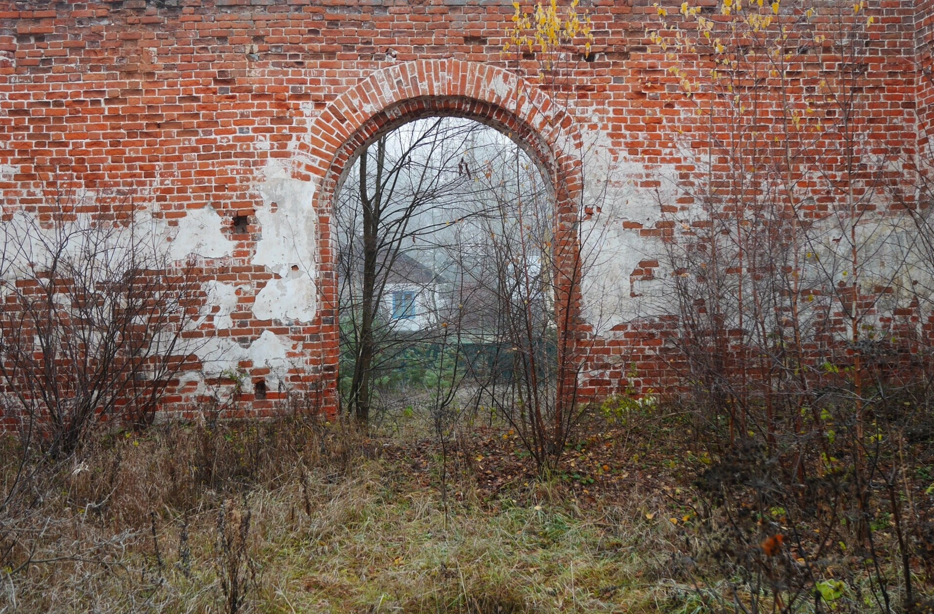 На представленной фотографии запечатлены скорбные останки некогда величественного храма - Церкви Рождества Пресвятой Богородицы в селе Старая Ситня. Снимок демонстрирует фрагмент разрушенной кирпичной стены с арочным проемом, который ведет во внутреннее пространство храмовой территории. За аркой просматривается заросшая местность и уцелевшая часть церковного здания, стоящего в отдалении.