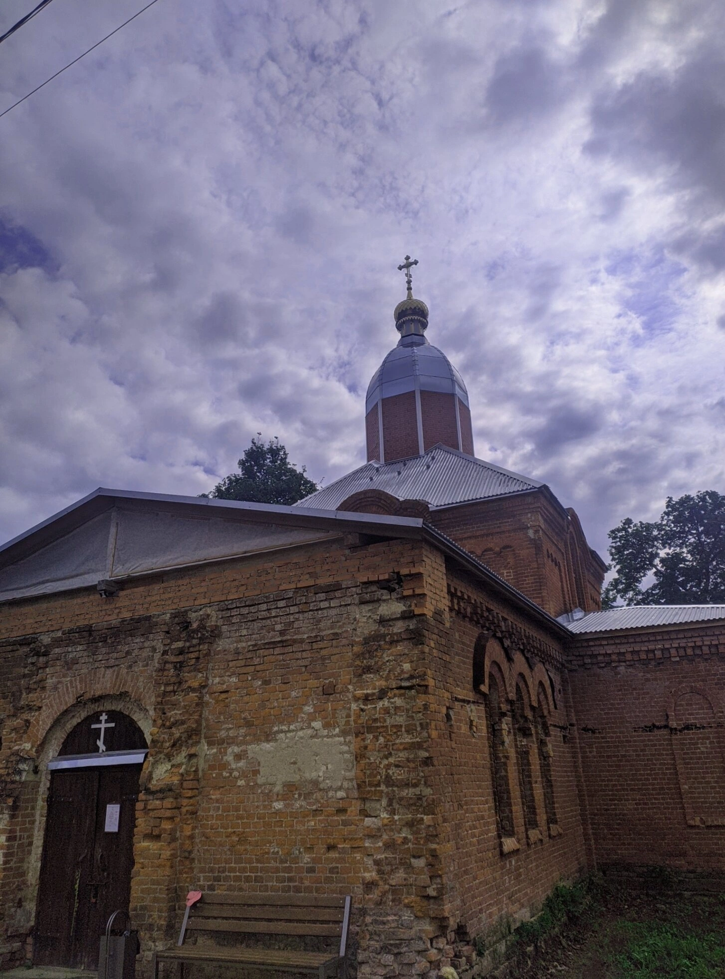 В нижней части сооружения виден арочный дверной проём с крестом над входом, что традиционно для православных храмов. Стены церкви сохранили следы времени, что свидетельствует о её почтенном возрасте и исторической значимости. Храм окружает естественный природный ландшафт с деревьями и облачным небом, создающий особую атмосферу духовного уединения.