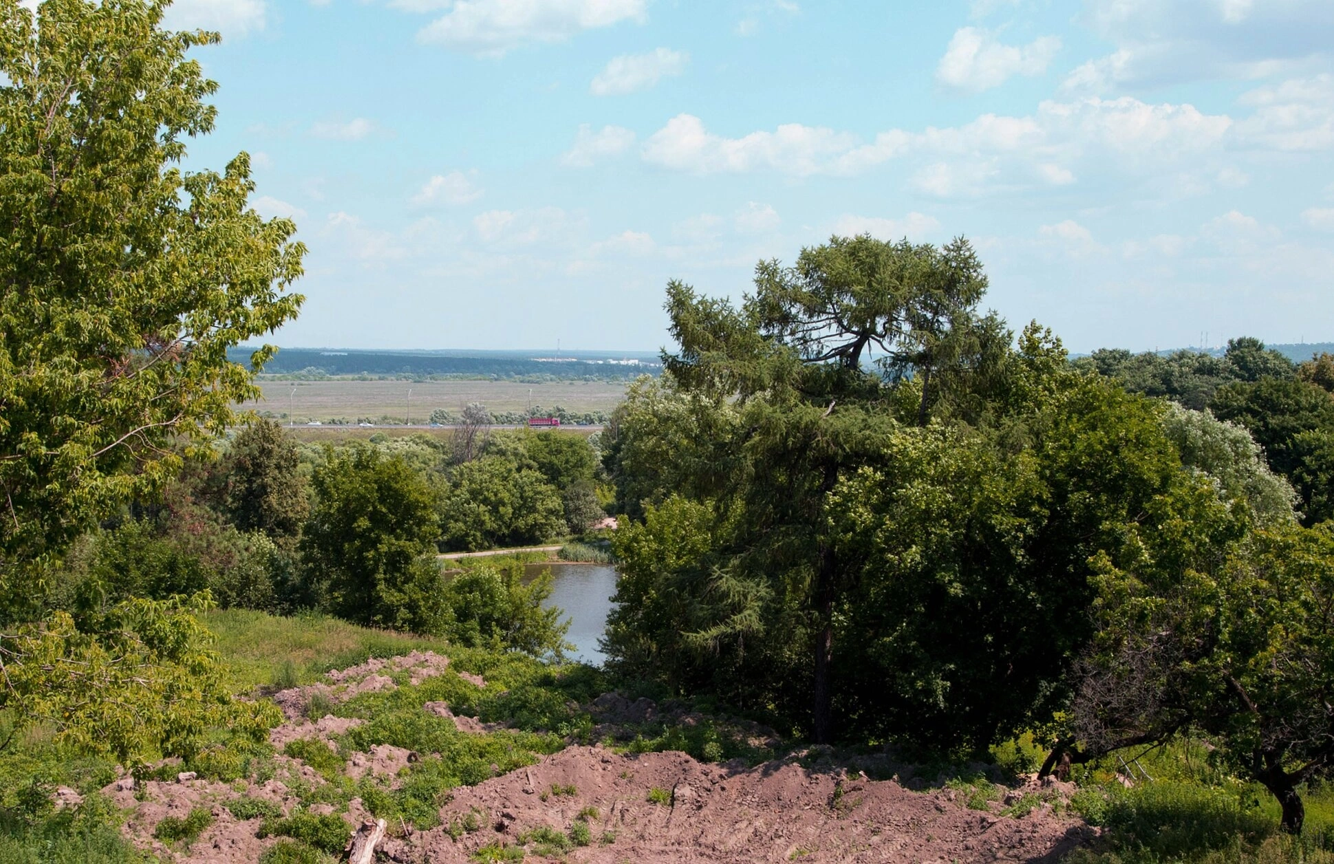 Передний план композиции представляет собой естественный природный ландшафт с травяным покровом и участками почвы, что создаёт ощущение единения с природой. Средний план заполнен богатой растительностью — лиственными деревьями и кустарниками, сквозь которые просматривается водная гладь местного водоёма, добавляющая пейзажу особую умиротворённость.