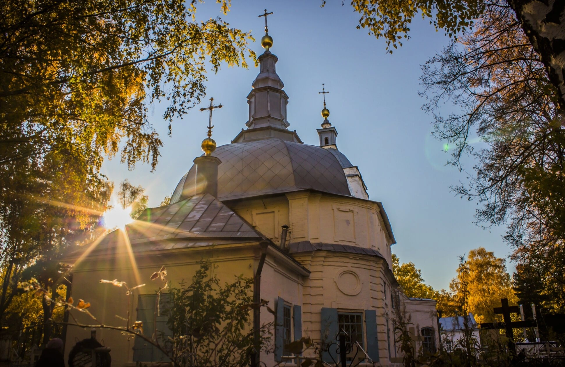 Освещение на фотографии создаёт особую, умиротворённую атмосферу благодати. Яркий солнечный свет, пробивающийся сквозь кроны деревьев, образует световой ореол вокруг церкви, что придаёт снимку торжественность и духовную радость. Лазурное небо на заднем плане гармонично сочетается с златом осенней листвы, создавая палитру тёплых и чистых тонов.