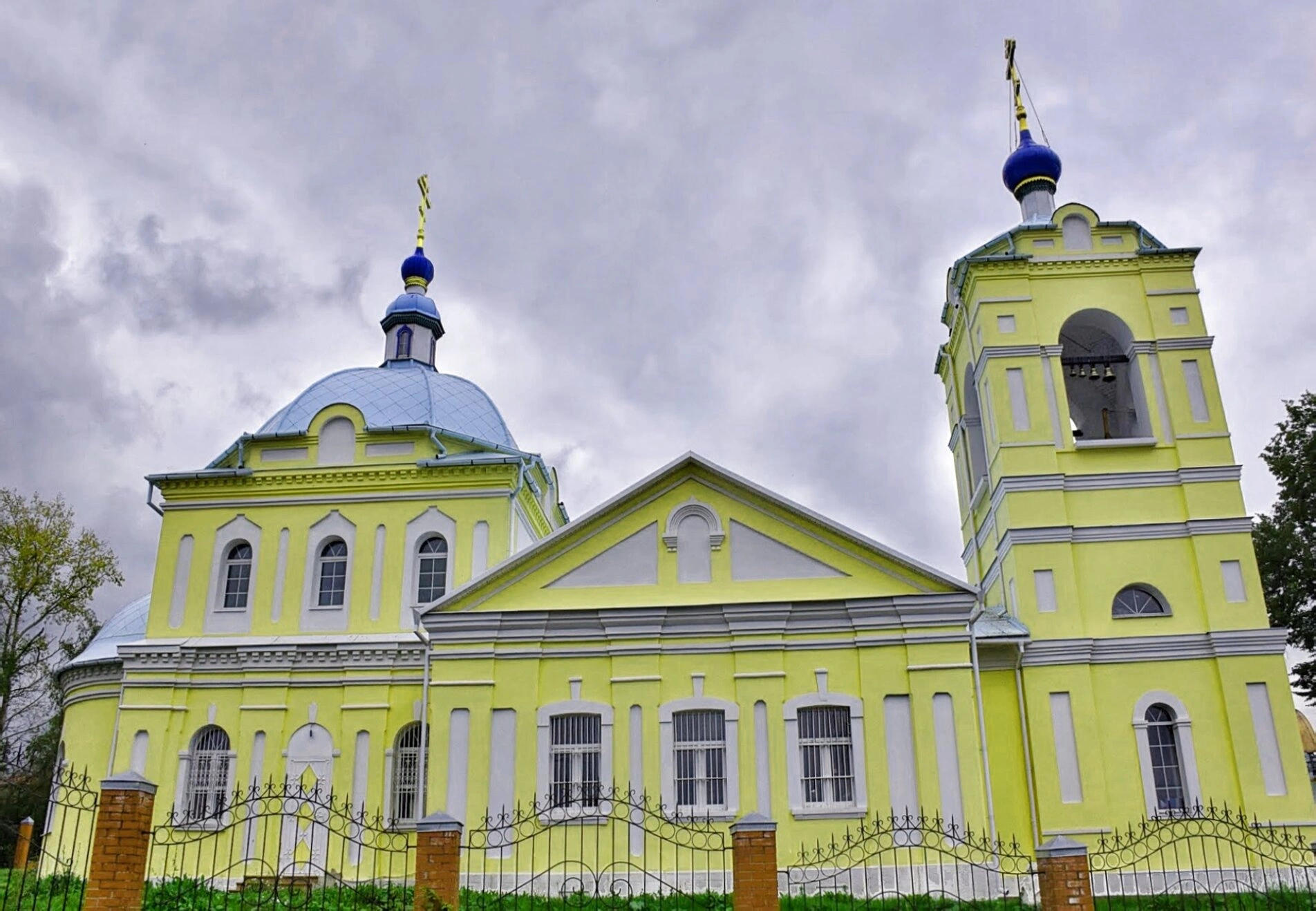 Храмовая постройка включает в себя основное здание церкви и колокольню, объединенные в гармоничную архитектурную композицию. Фасад здания окрашен в теплый желтый цвет, а архитектурные детали — наличники окон и карнизы — выделены белым цветом, что создает выразительный контраст и подчеркивает изящество форм.